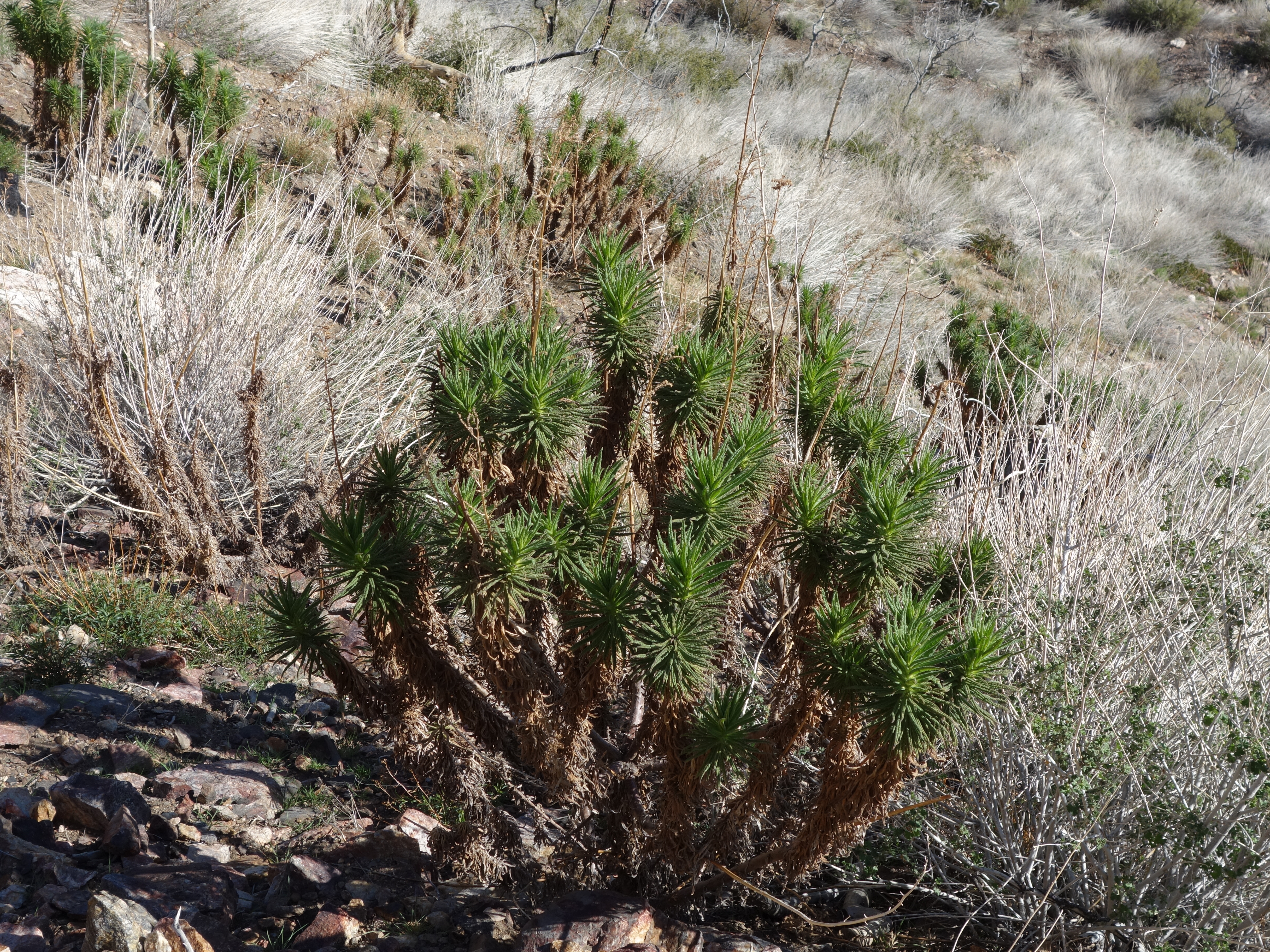 We finally know what poodle dog bush looks like. It’s a native plant that grows after fires. If you touch it you can get a rash worse than poison oak. Later it will have pretty purple flowers.