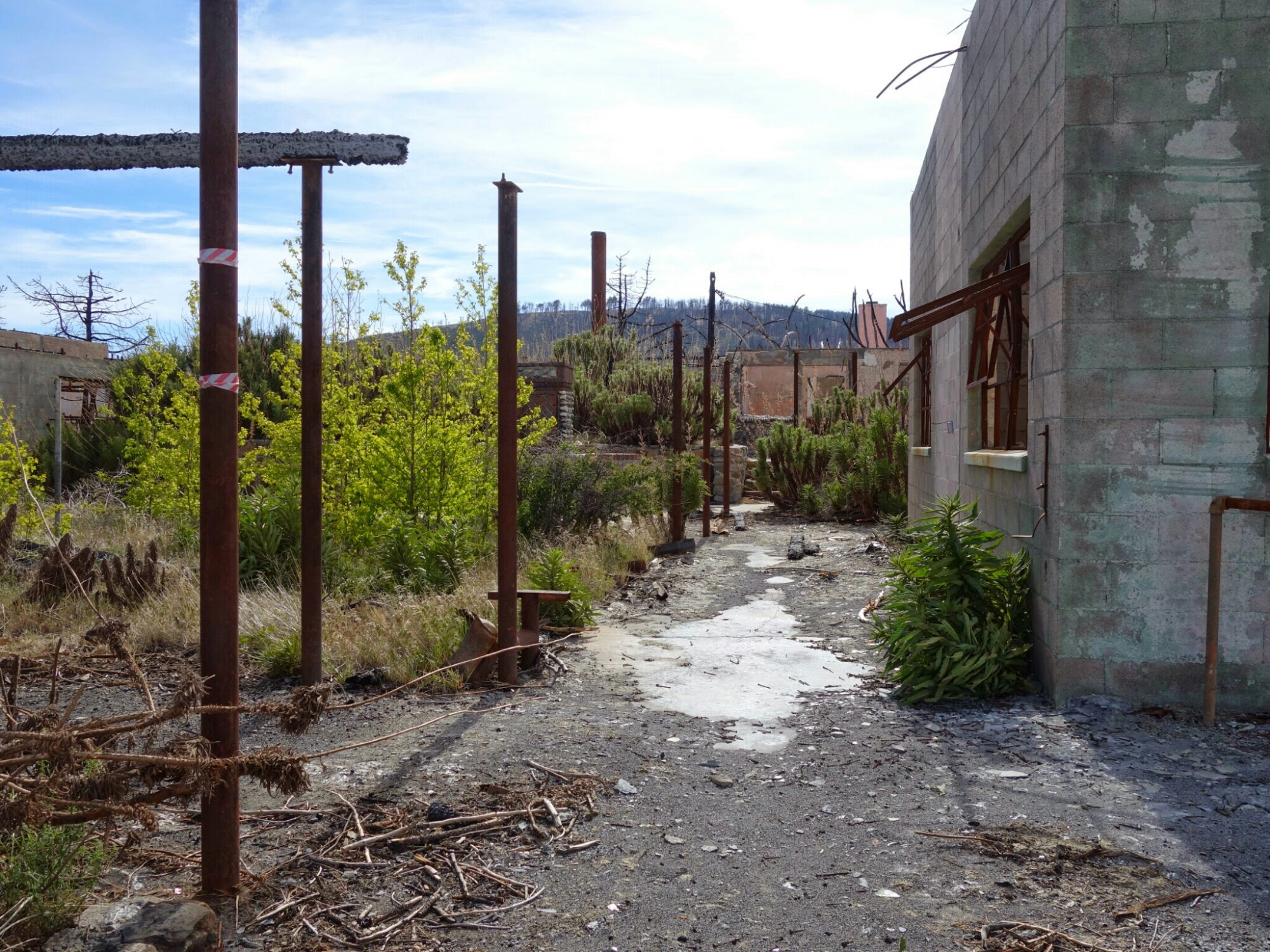 Unfortunately Poodle Dog Bush is everywhere. The first part of the day the trail had been mostly cleared of the nasty stuff. Thanks to whomever did that. We walked thru a burned prison. Eerie place.