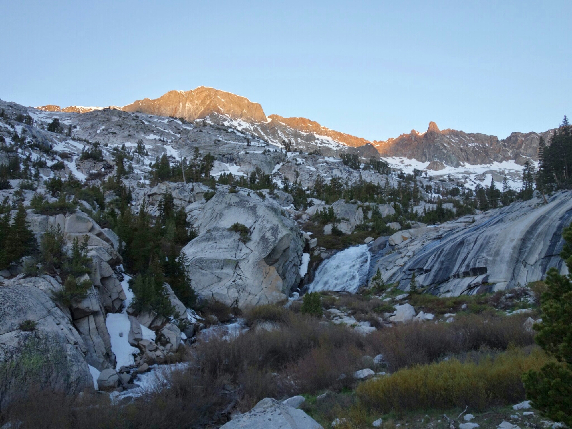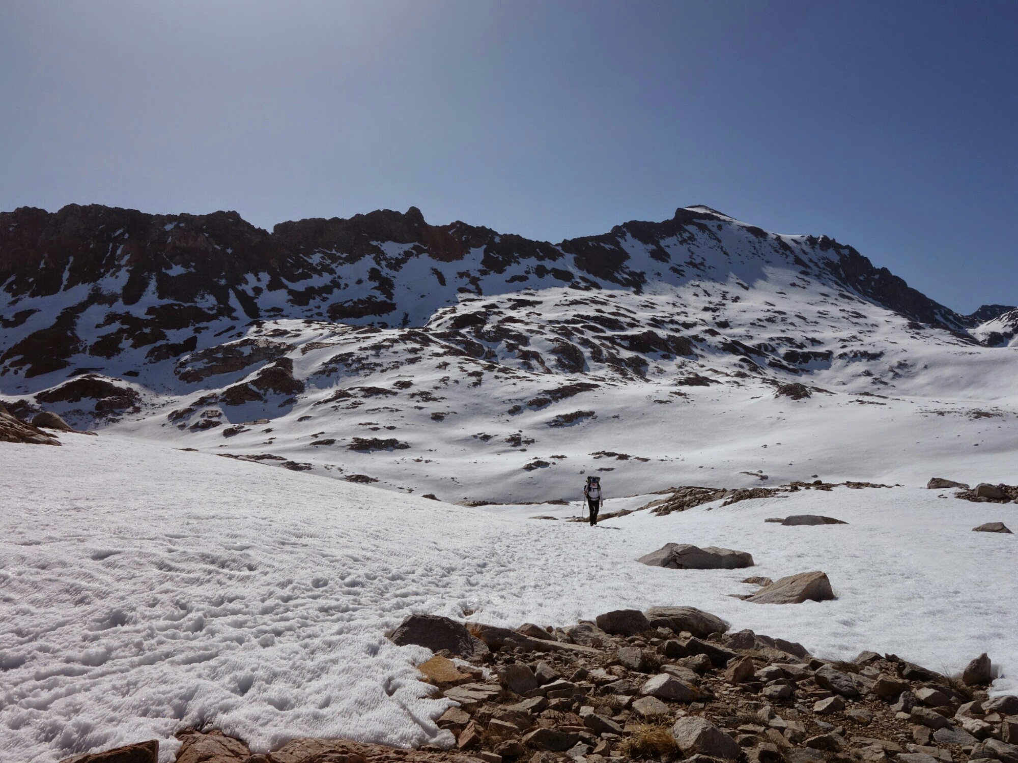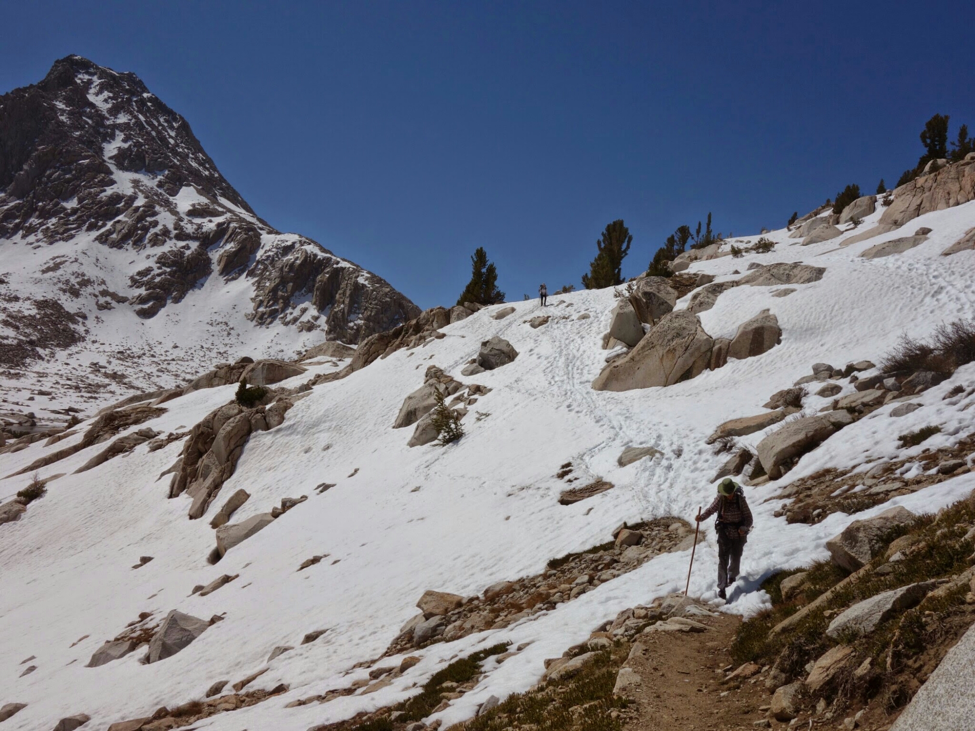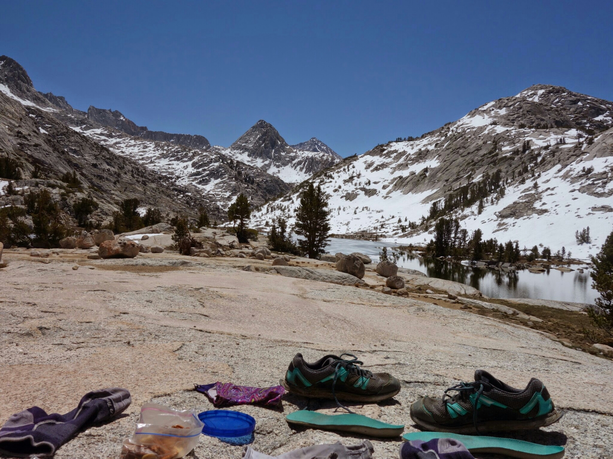 We timed the snow over Muir Pass perfectly. A slight crunch but hard until we were mostly out of it on the north side. It’s so much easier to walk when you are not post holing every step.