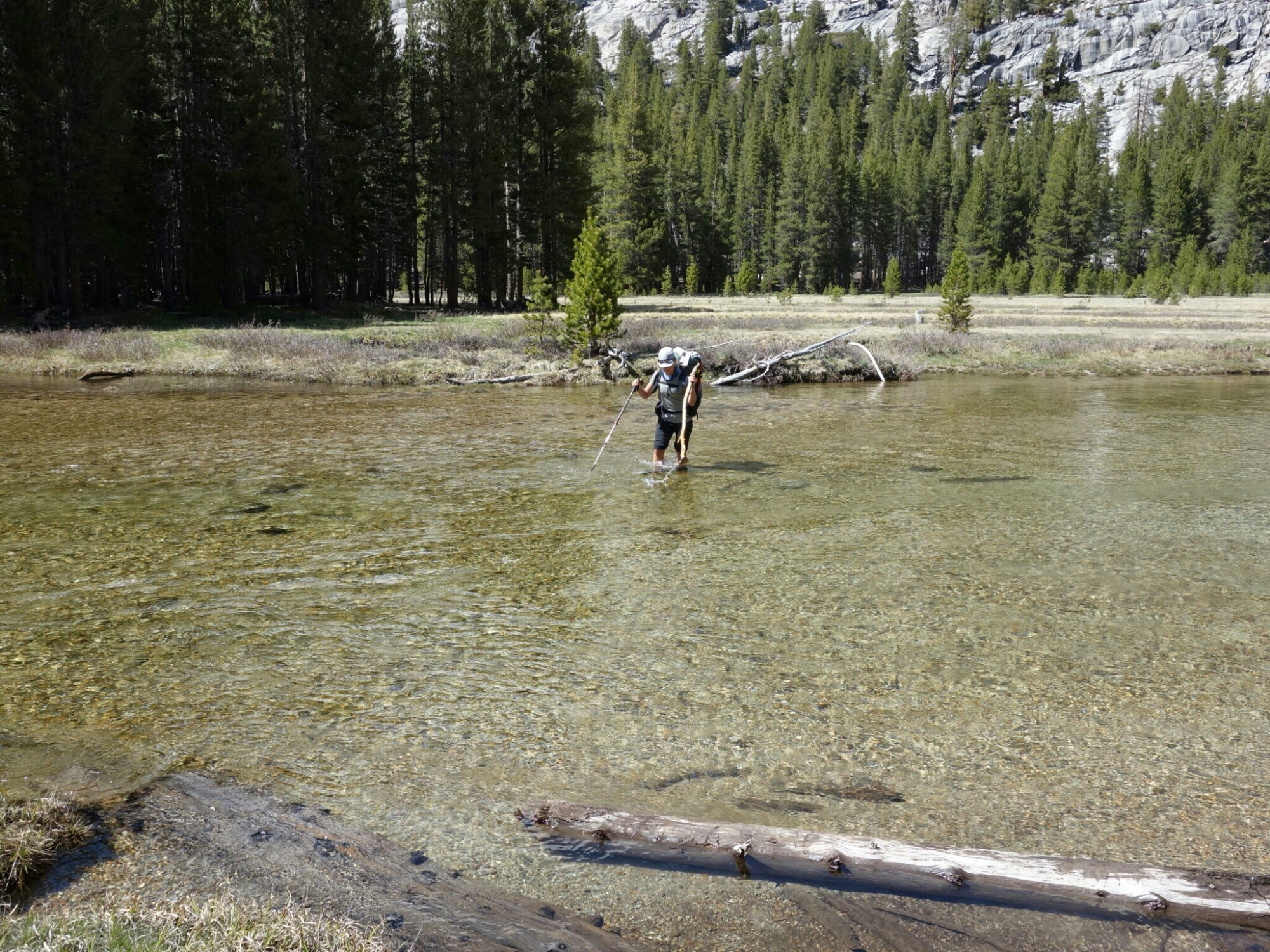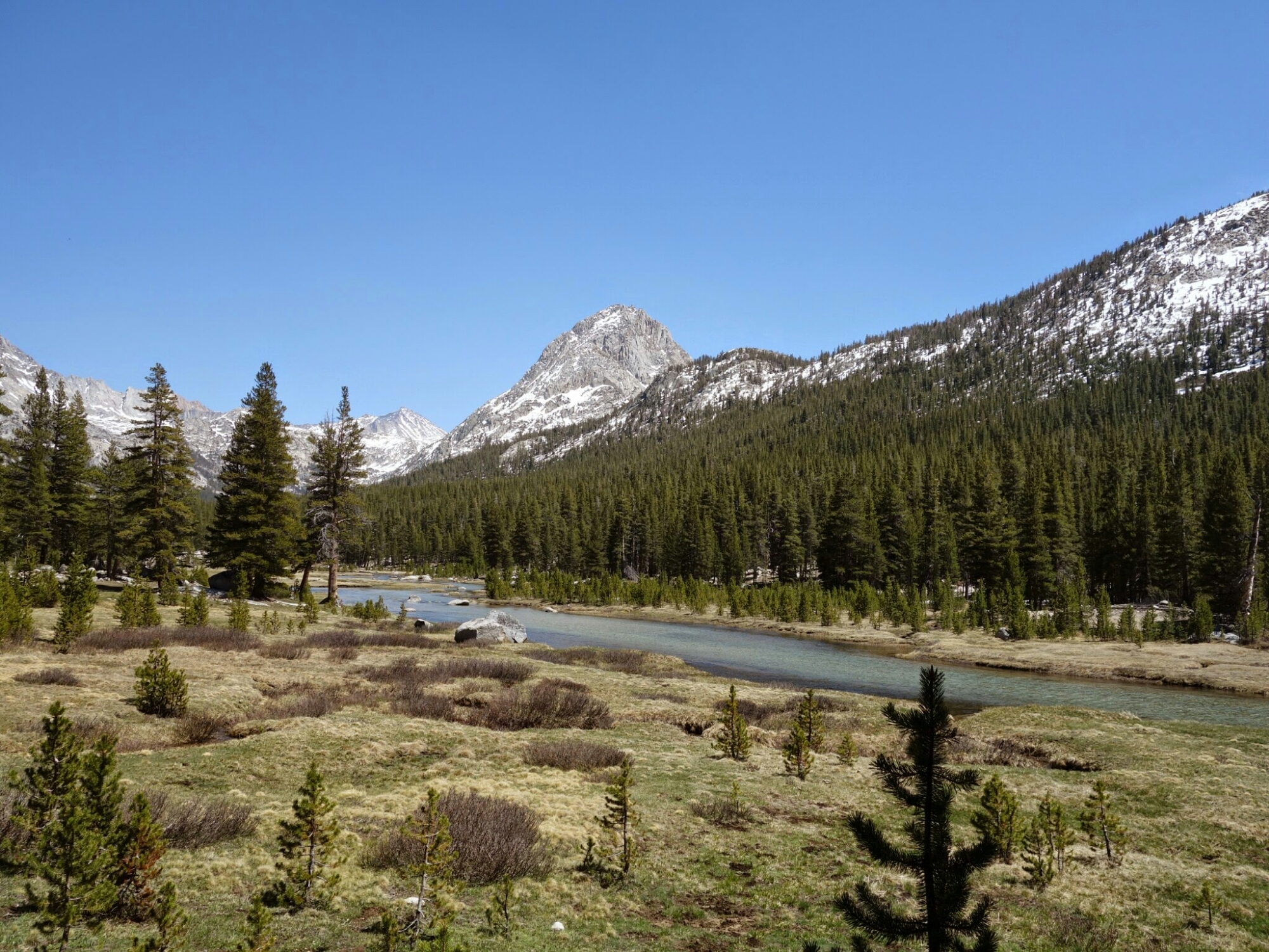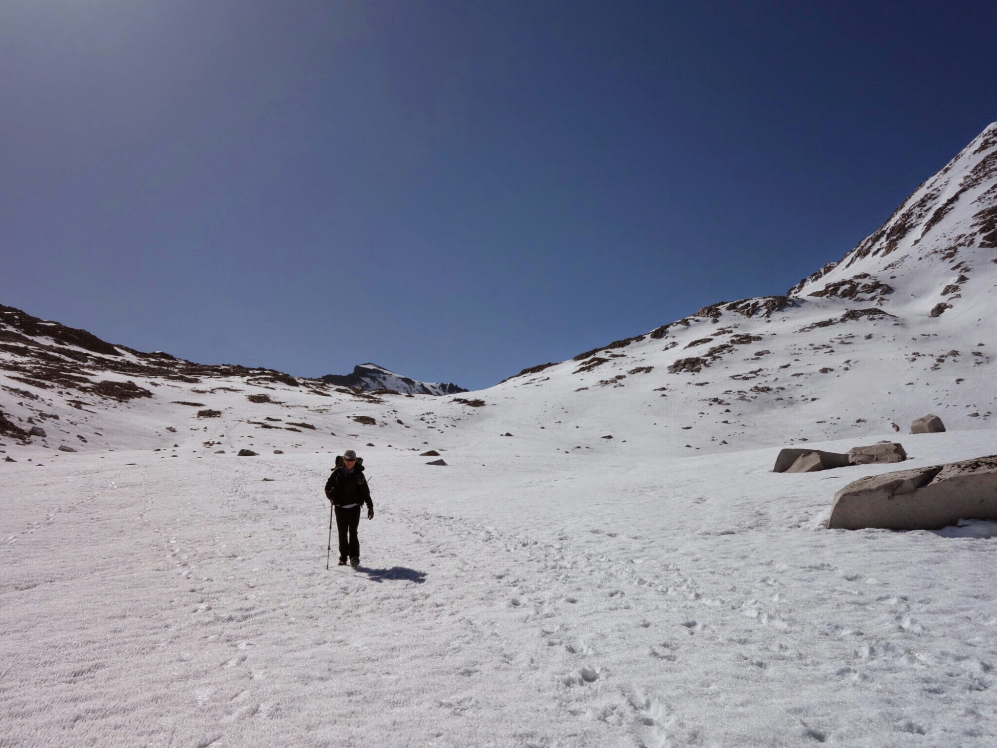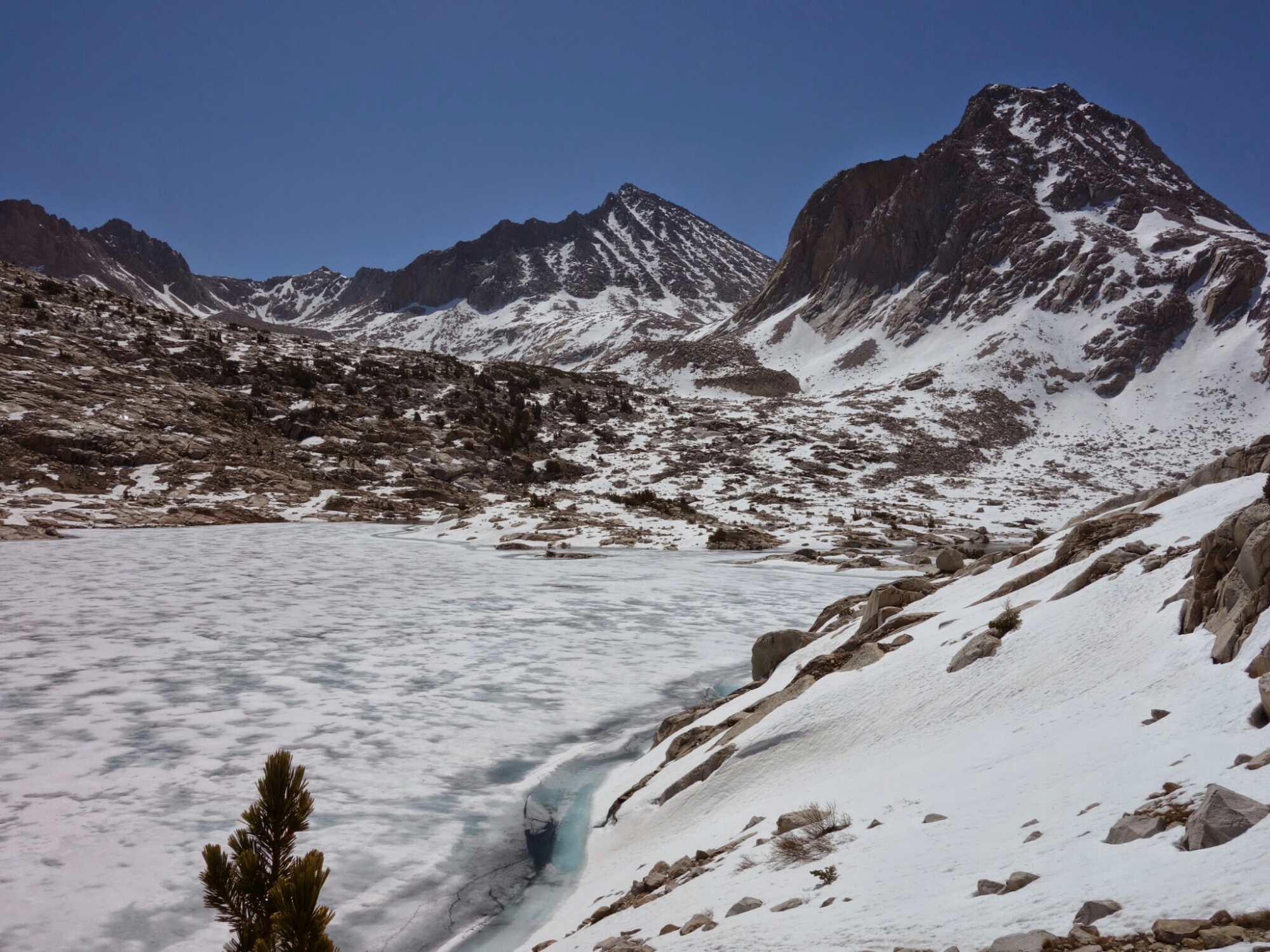 We timed the snow over Muir Pass perfectly. A slight crunch but hard until we were mostly out of it on the north side. It’s so much easier to walk when you are not post holing every step.