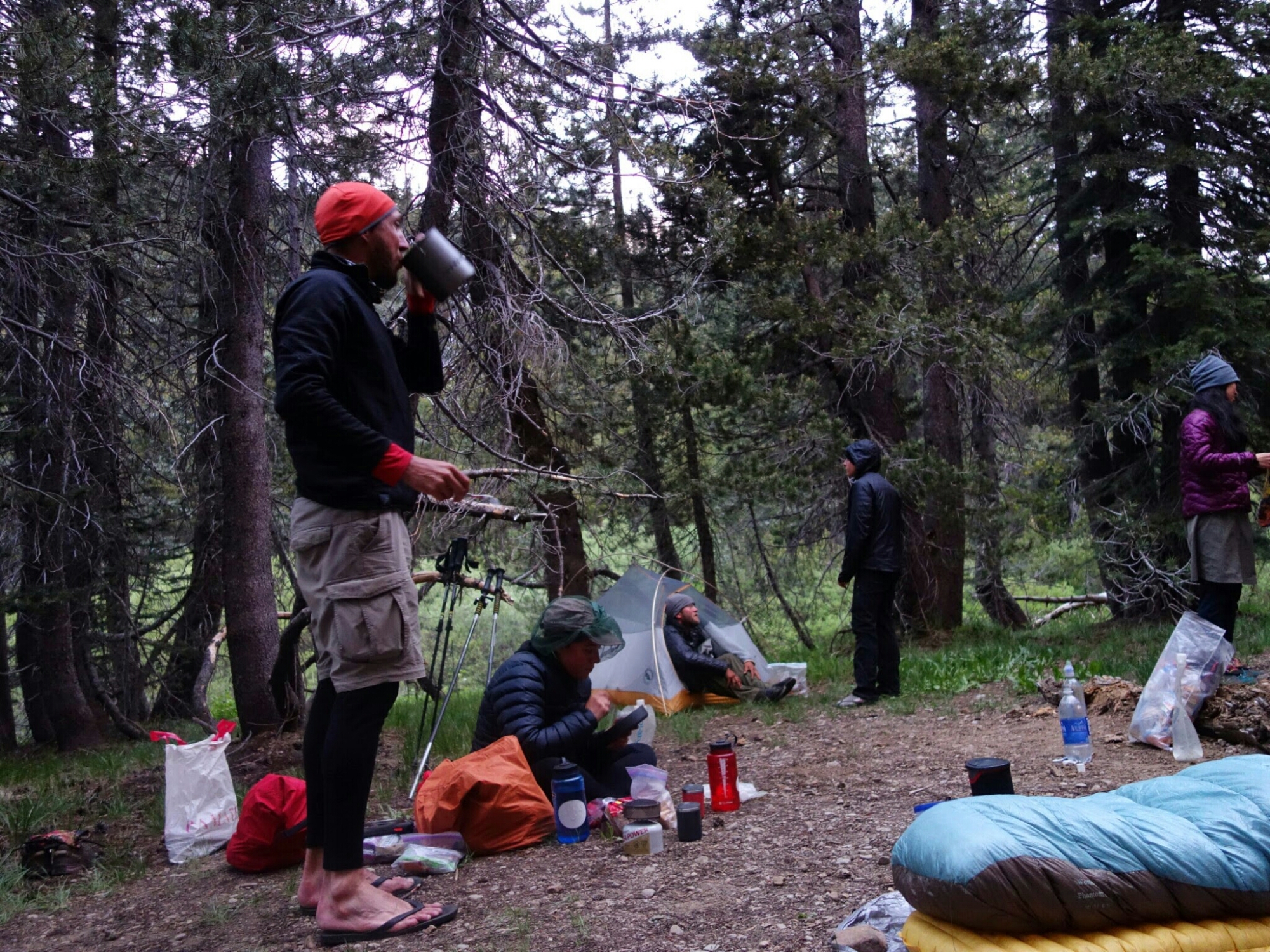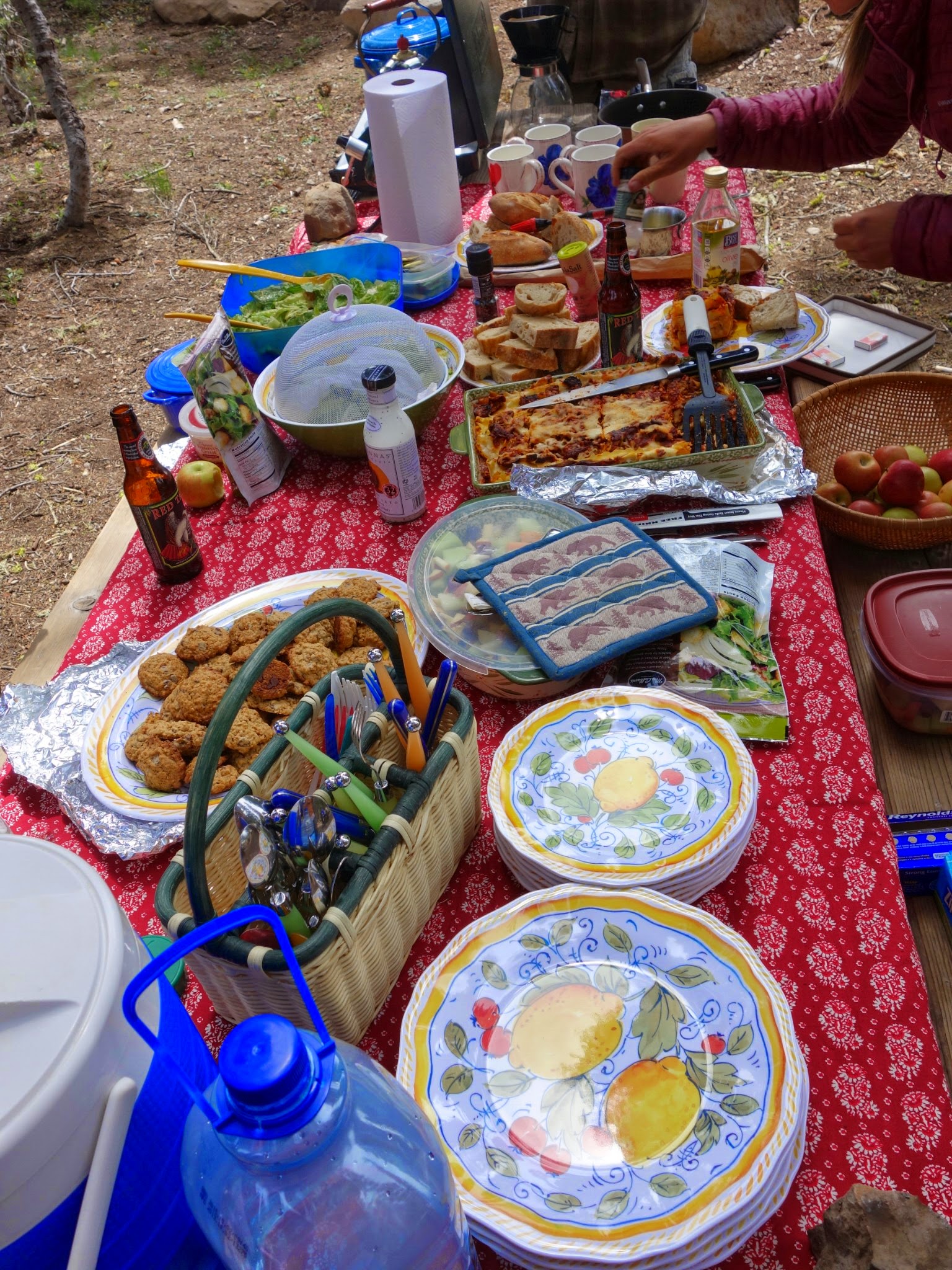 Trail magic on steroids. Jeanine and Bob thought of everything a thru hiker could want. Lasagne, buttered french bread, Ceasar salad, fruit salad, stewed vegetables, cookies, chairs, foot soaks, blankets, tea, coffee, beer, sodas, and big smiles. About 12 hikers soaked up the food and love until we were in food comas.