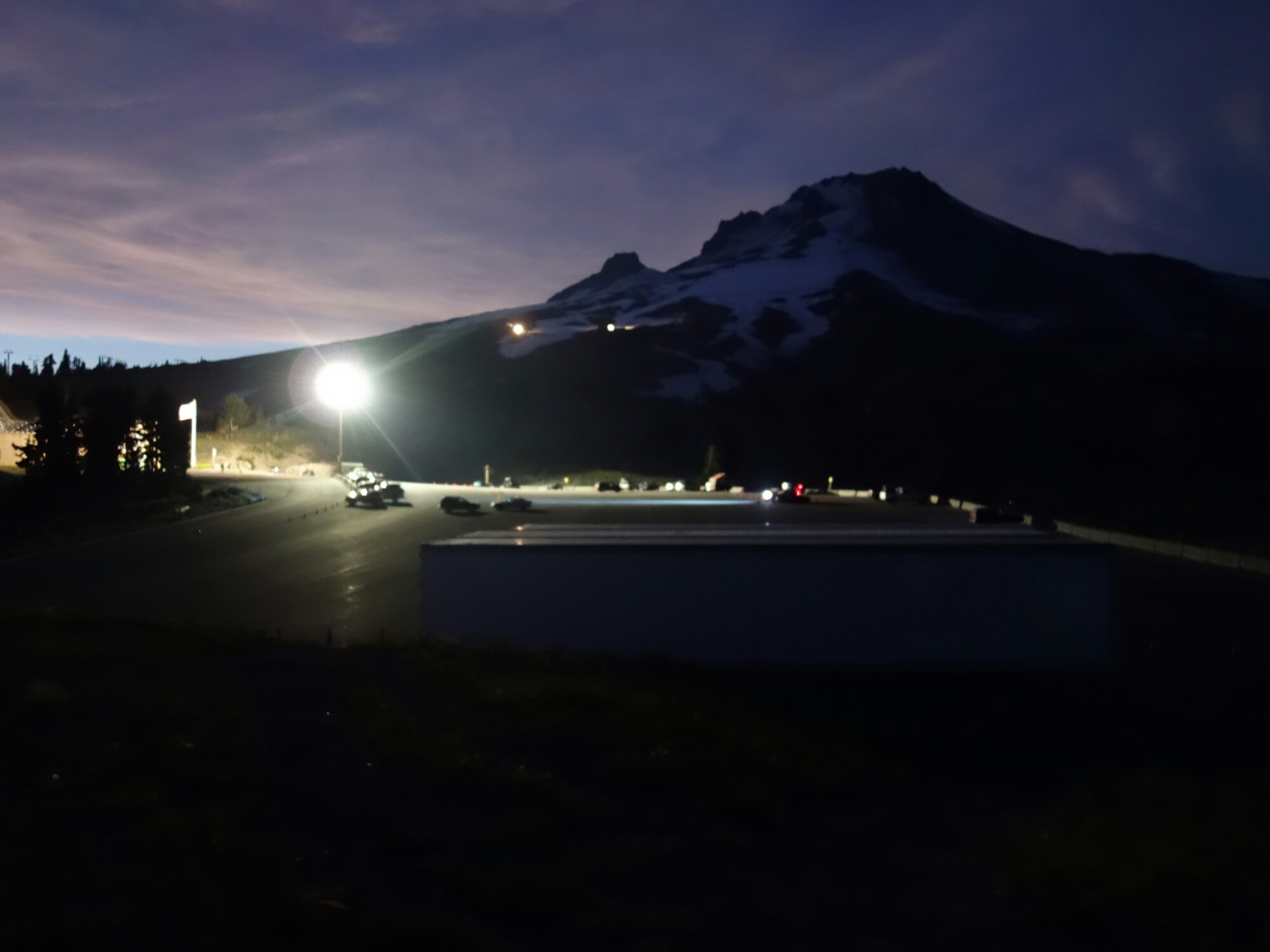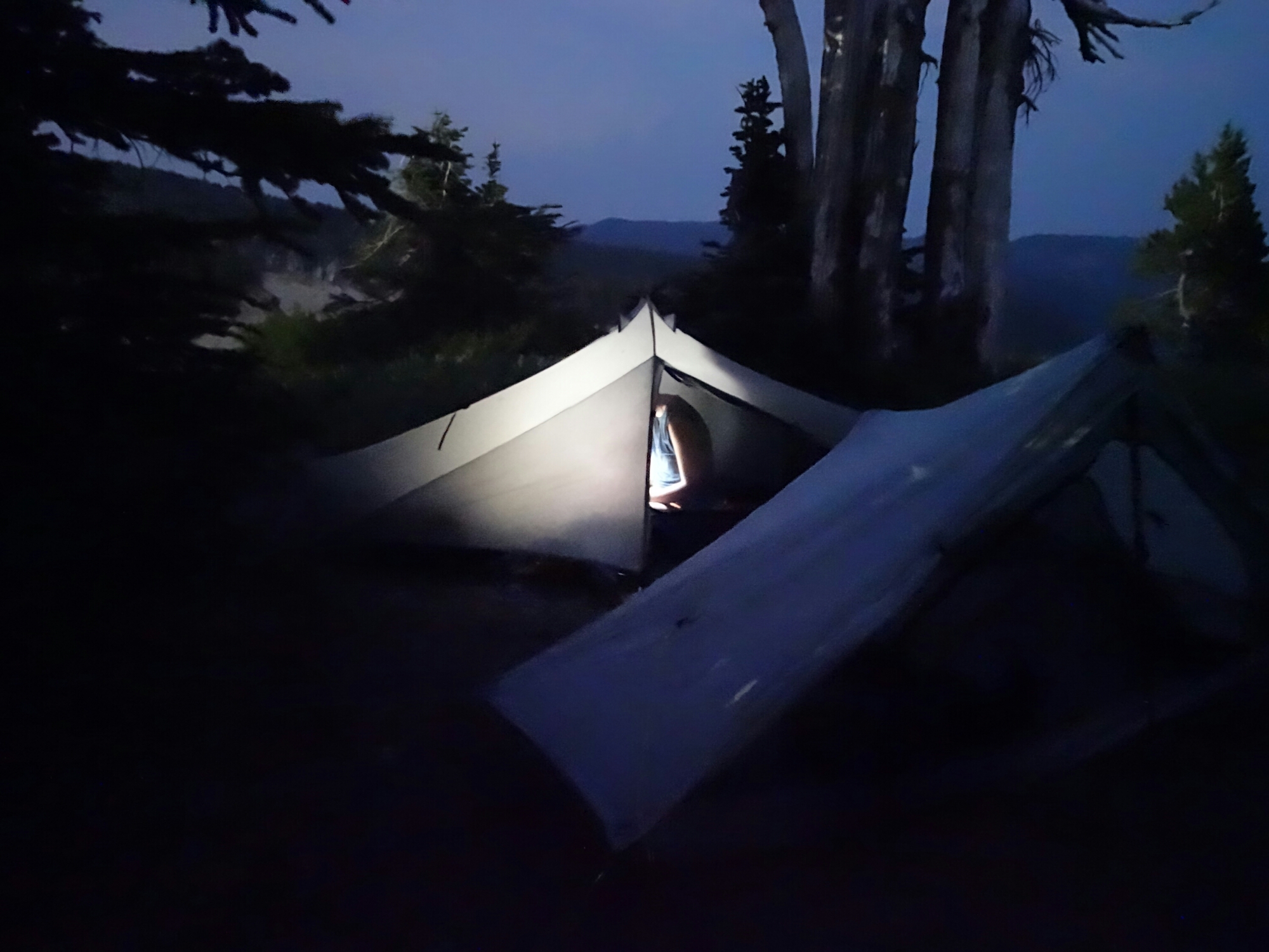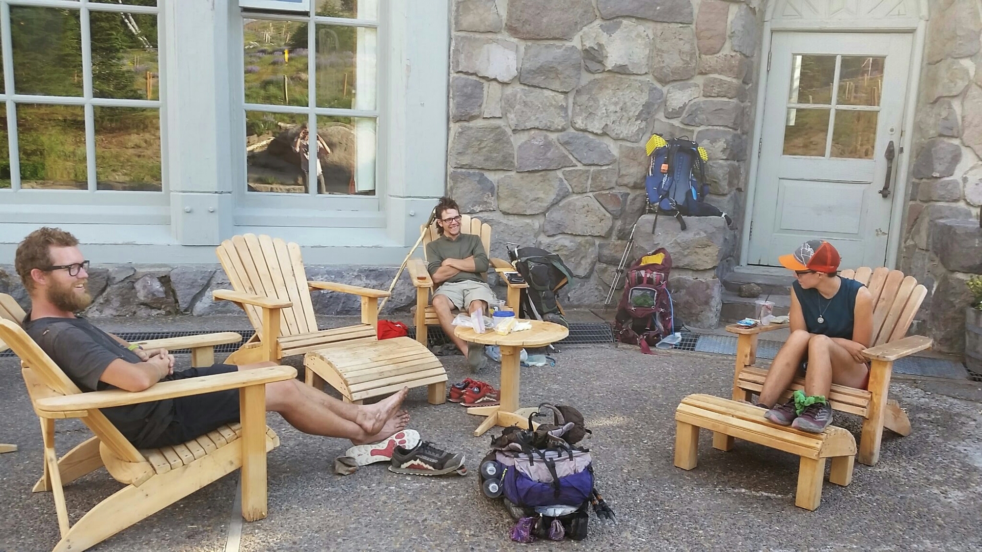 Bigfoot, MountainGoat and I watched the sunset while eating our backpacking dinners on the front deck. We are now camped above the lodge in the trees. Breakfast buffet tomorrow!
