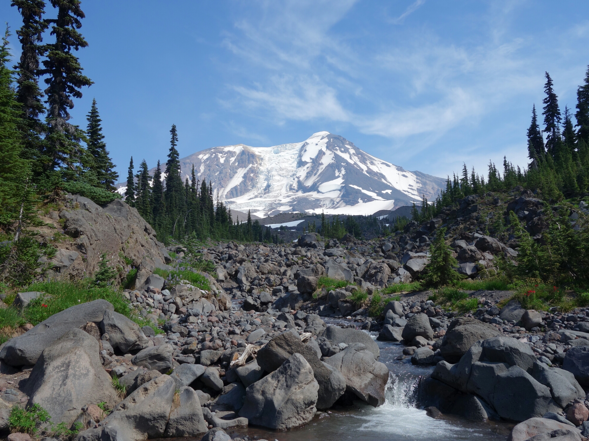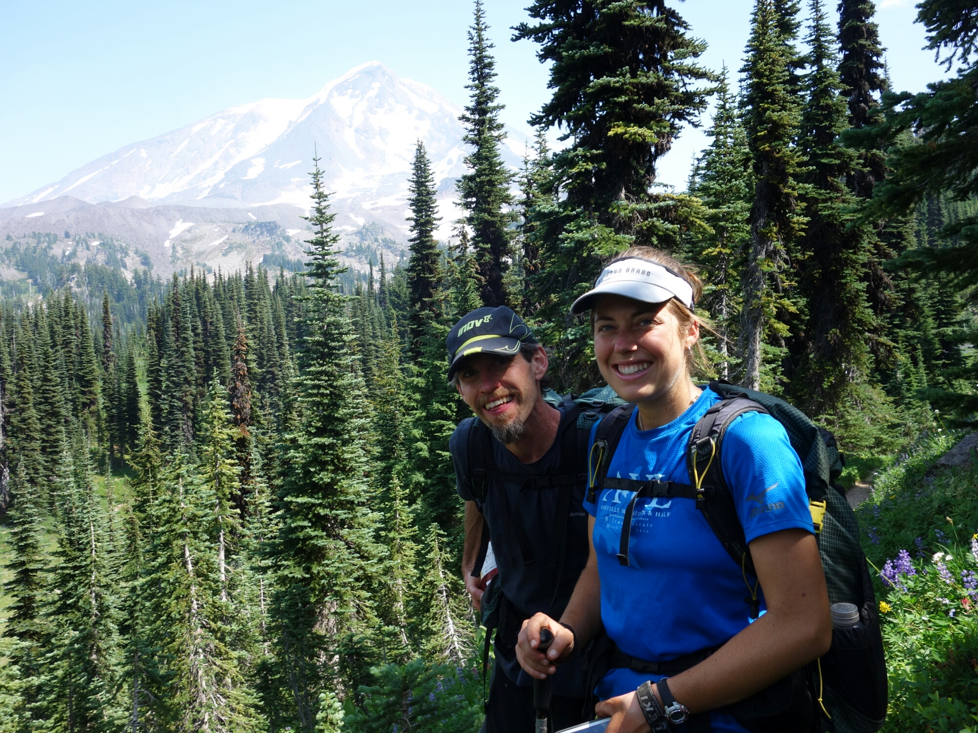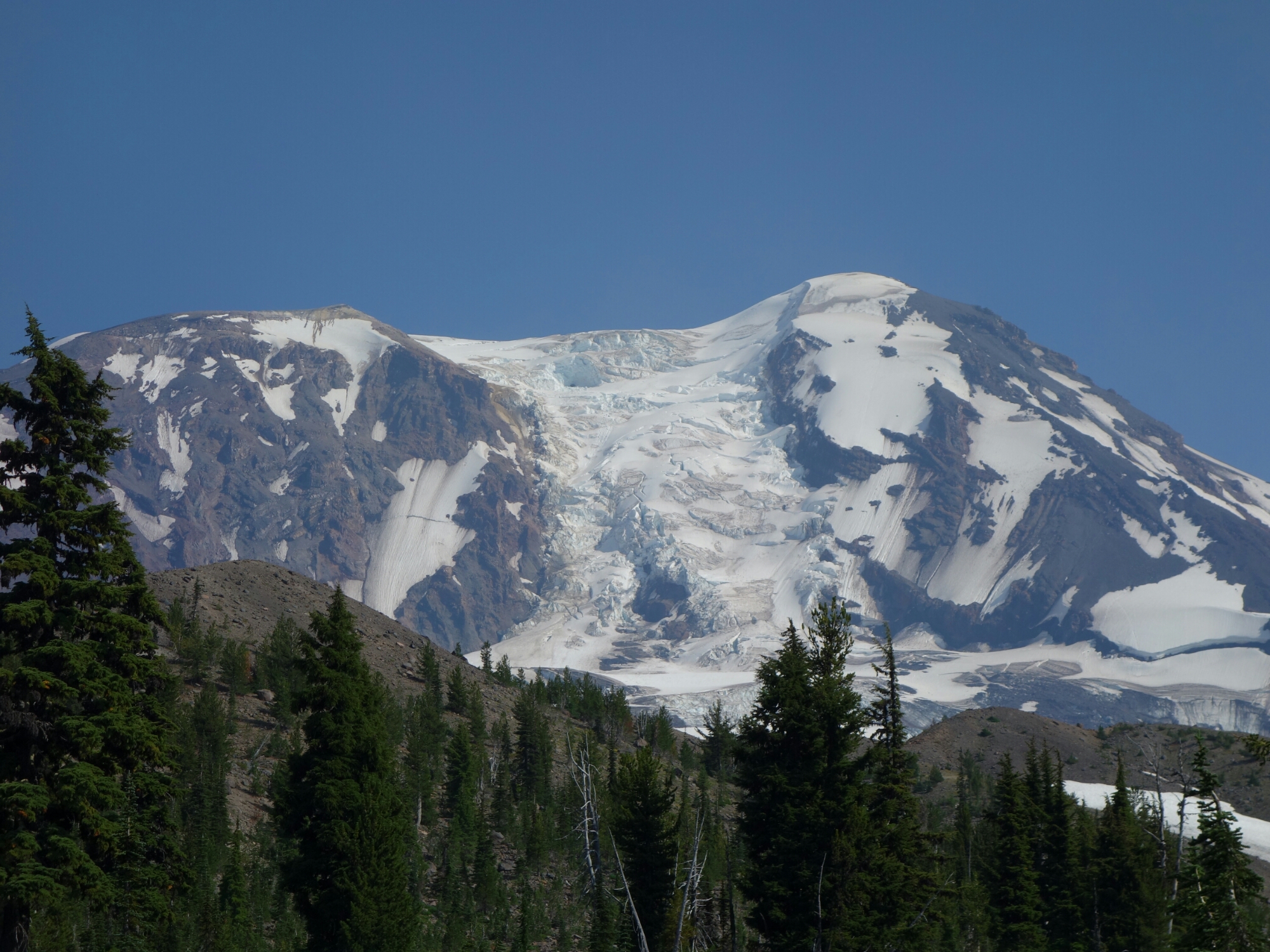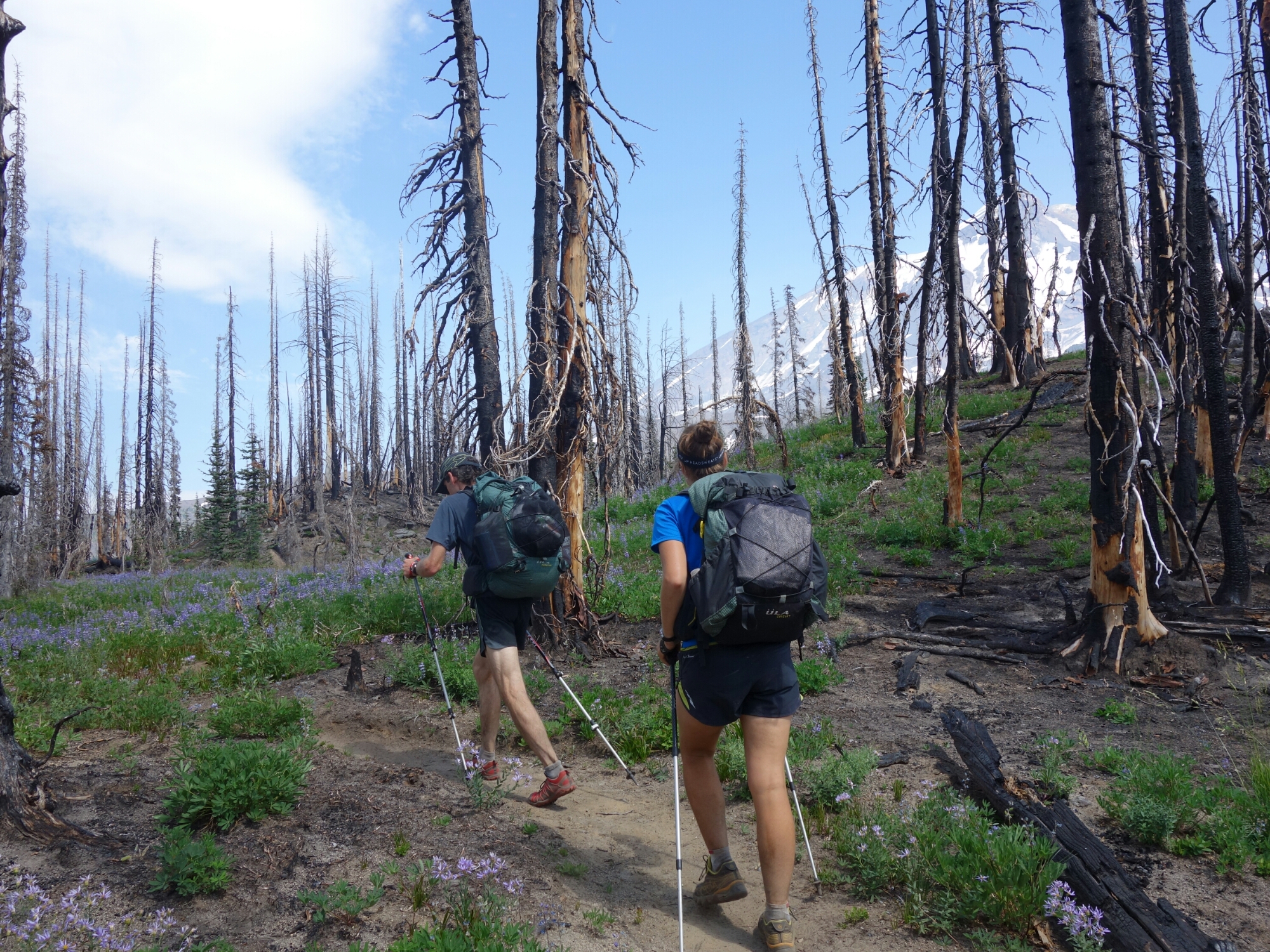 I hiked with Atlas all day and am now camped with him. We hiked near Mt Adams much of the day. I took a bazillion photos of it. We walked thru a huge burn area that happened after 2009. That did allow lots more views of the mountain. And the wild flowers were in full bloom. Unfortunately the flies were out in force and would swarm us if we stopped. So we didn’t stop much.