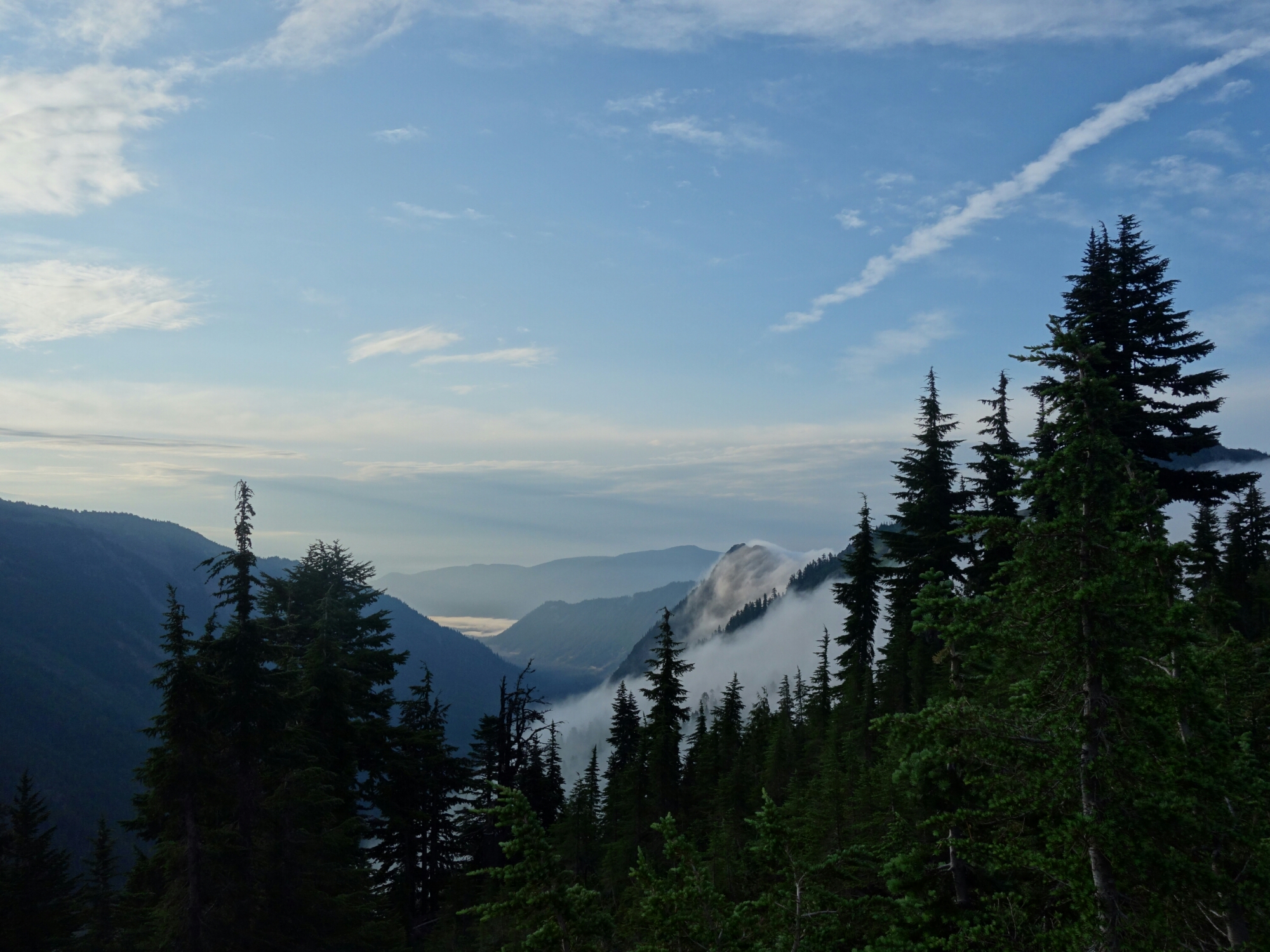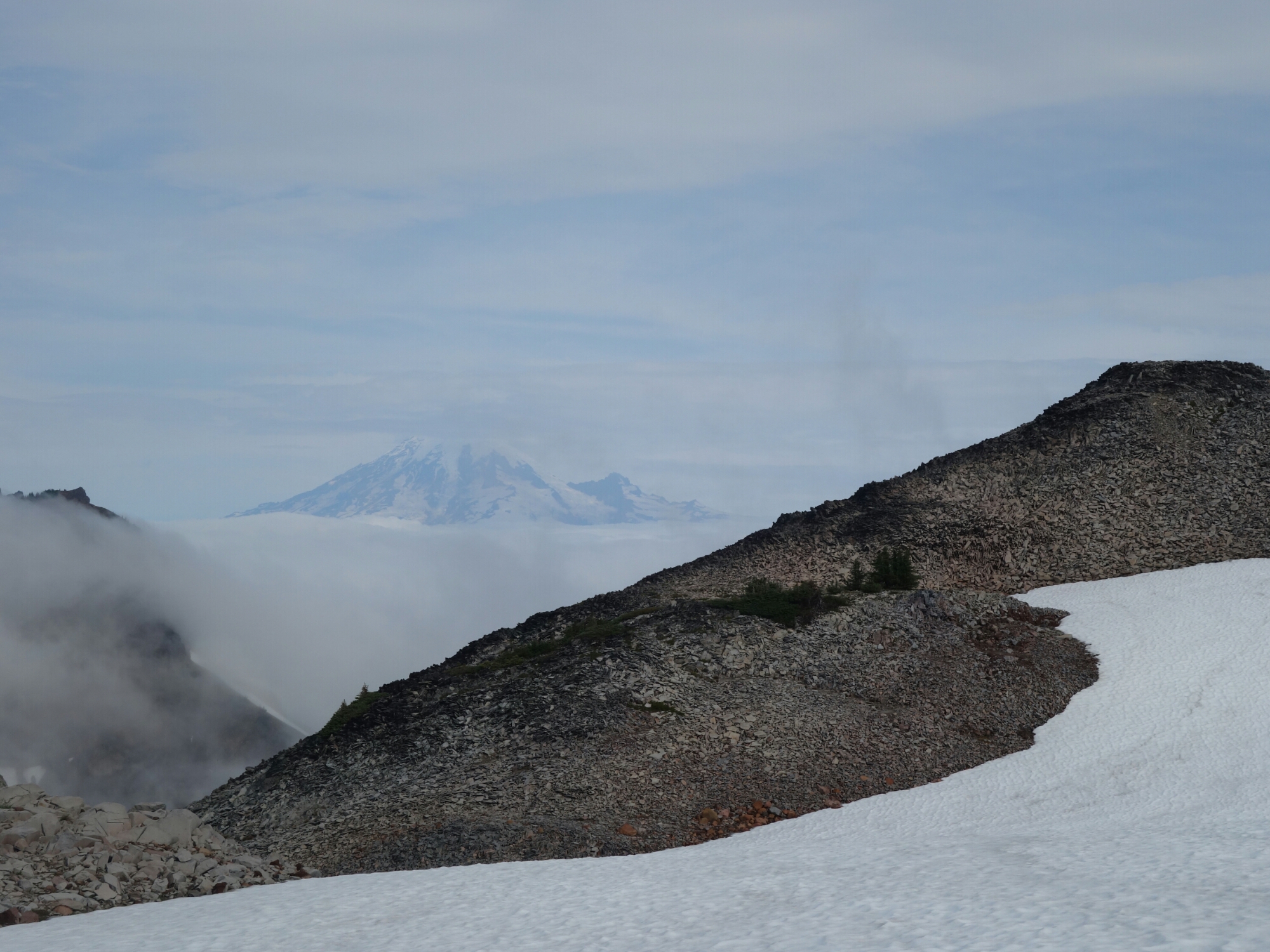 As I climbed up the sun tried mightily to break thru. I could see Mt Rainer! A huge cloud bank sat just below it.