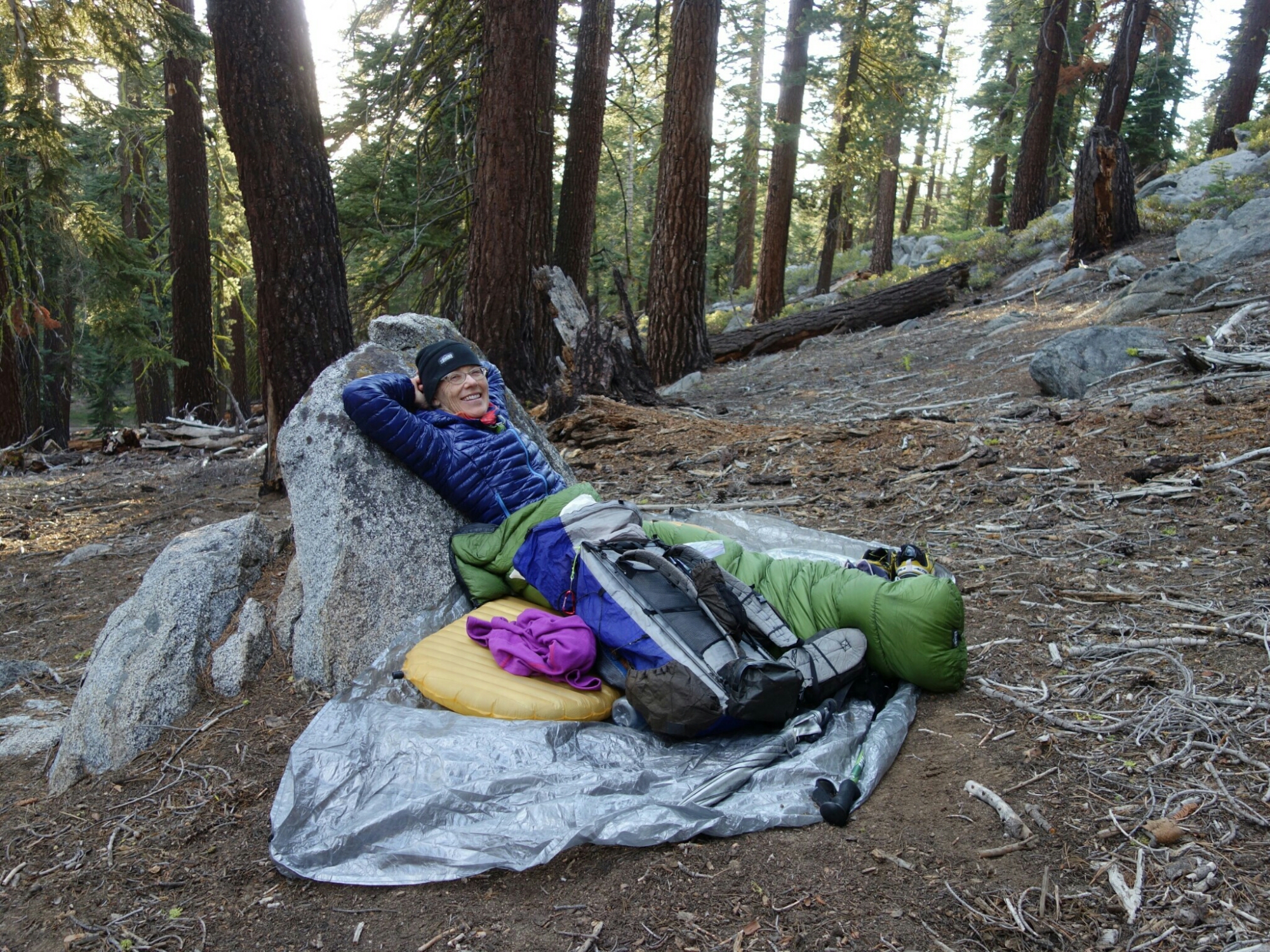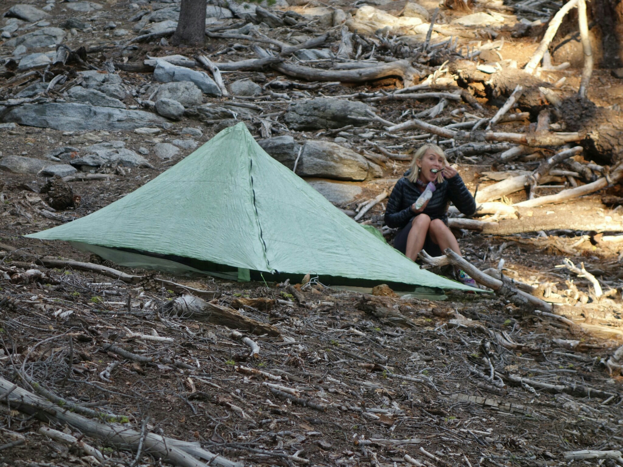 I love hiking with these two supercharged women. Non stop talking made the time fly by. We hiked extra miles to try to get a campsite with a view. But there was no level ground to be found with a view. And it isn’t all that flat here in the trees either. I am cowboy camping. The others are tenting. It is so awesome to be back out here where I belong.