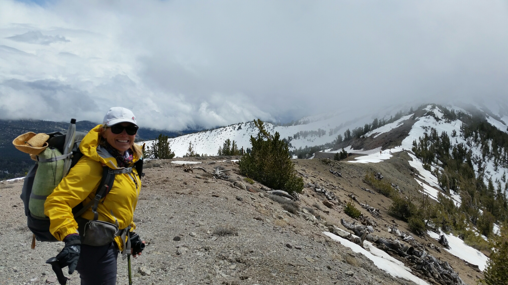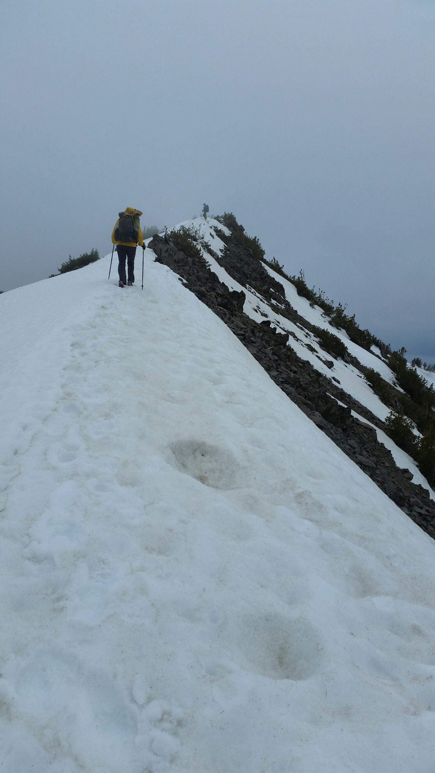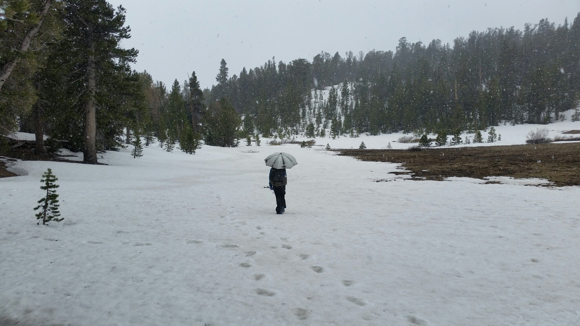 Surprise! There is still lots of snow out here. To add to fun it started snowing as we climbed up towards Relay Peak. The umbrella helped immensely in keeping me warm. But I haven’t perfected the hands free mode (unlike Wired and Rockin’) and it was awkward hiking over snow with one hand holding 2 poles and the other holding the umbrella. Lucky for us the snow stopped once we got in the more exposed areas. And the thunder stopped too.