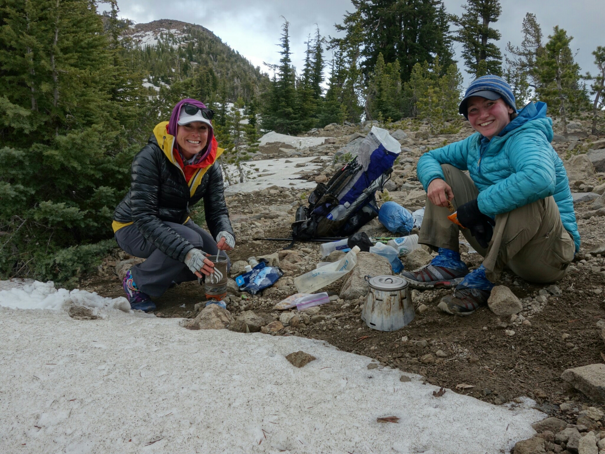 We were counting on a water source late in the day and then realized that it was off trail. The next source is 16 miles away. We weren’t excited about it but were willing to walk over a mile each way to get it and even camp down there. But then snow engulfed the trail. And it was threatening to rain again as predicted. Lucky for us, Rockin’ had a jetboil and plenty of fuel so we melted snow. We were incredibly lucky with the water content of the snow. A full pot of snow melted down to 3/4 of a pot of water.