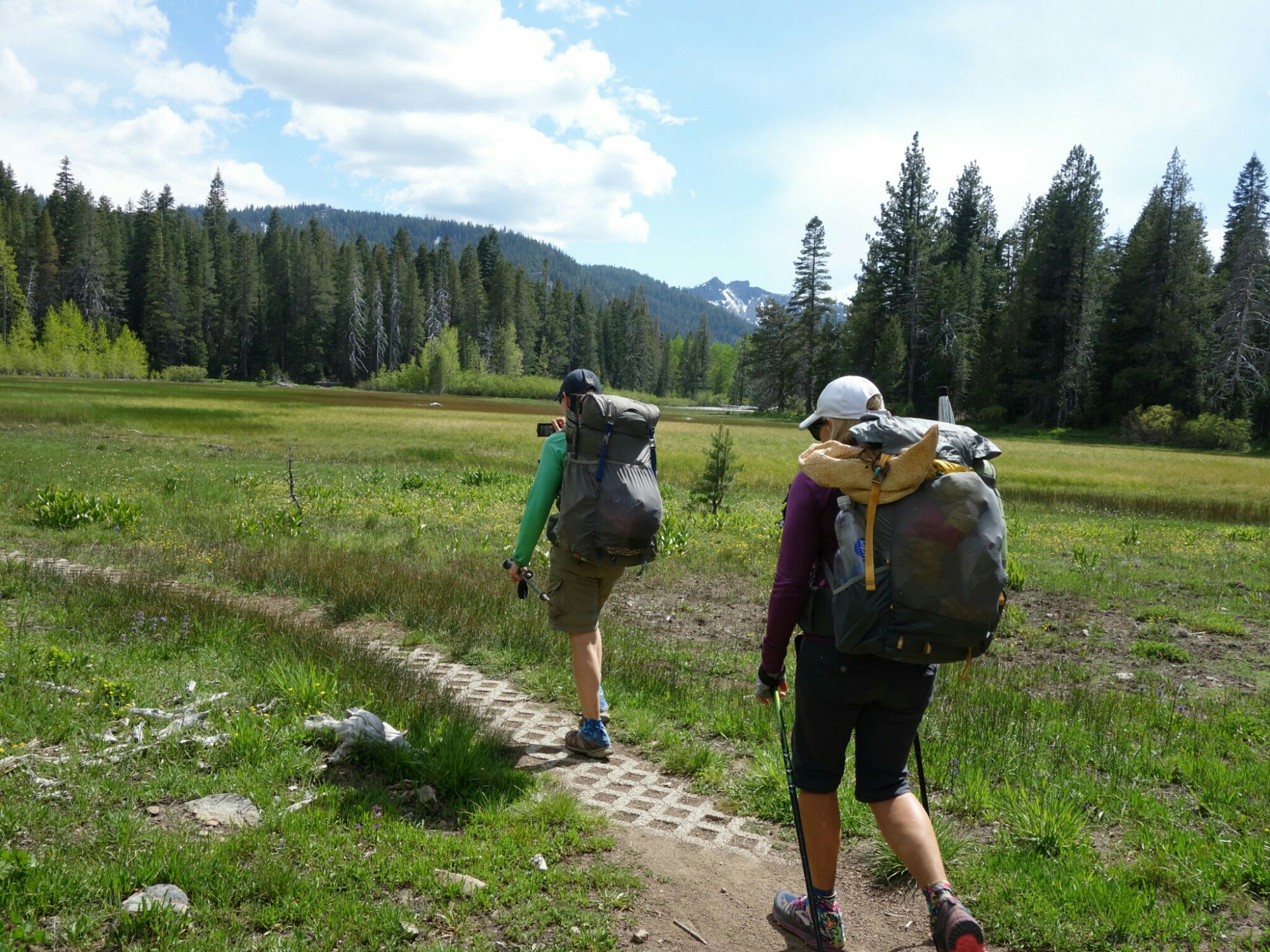 We are camped near a meadow with a gorgeous view of Twin Peaks. As we were looking around for a possible place to camp the sky darkened and we knew we needed to set up fast. None of us are on flat ground but we did all manage to be inside our tents when the rain hit. It was a pretty intense 20 minutes of hard rain, thunder and lightning. Some way closer than we would like.