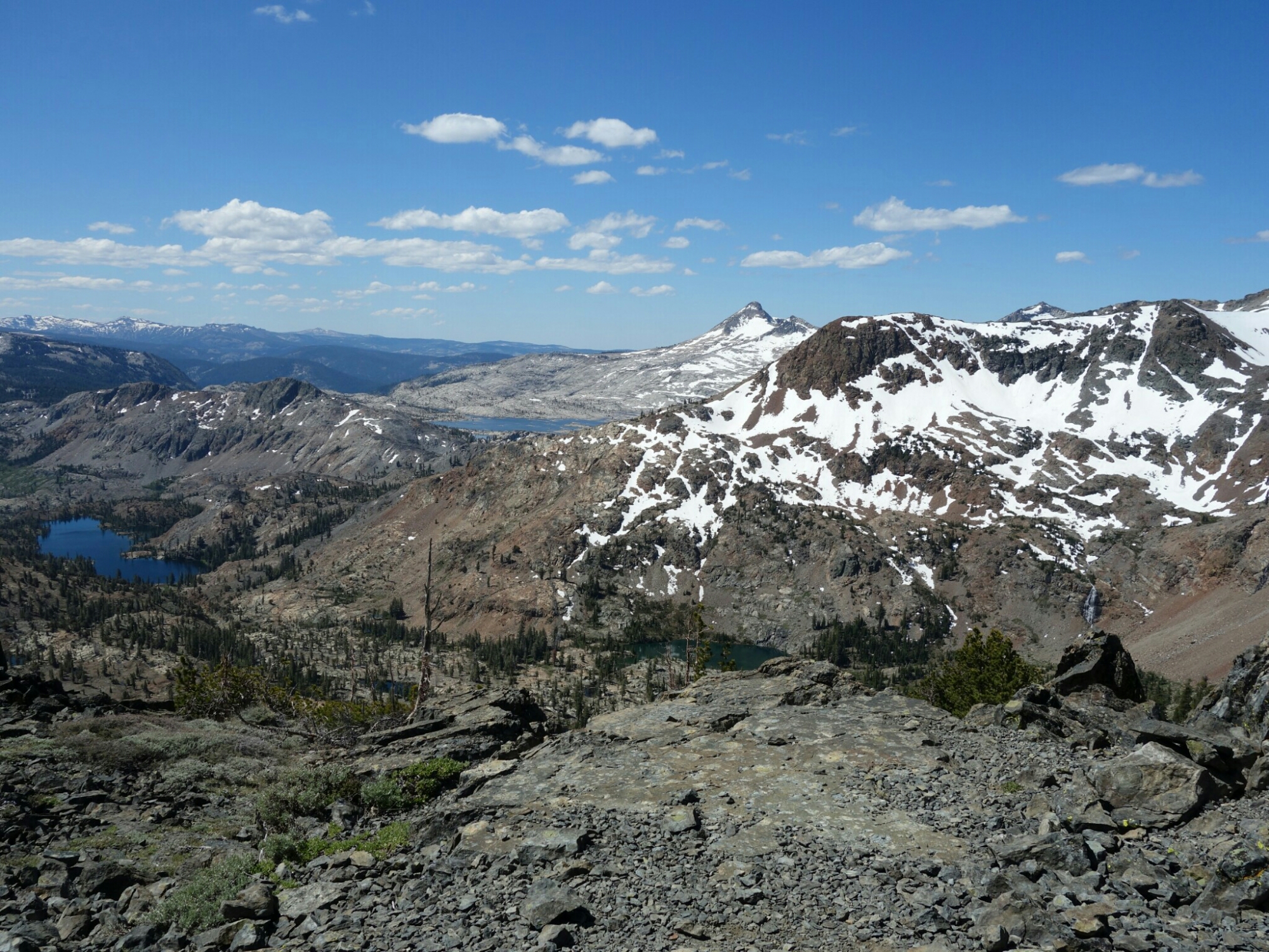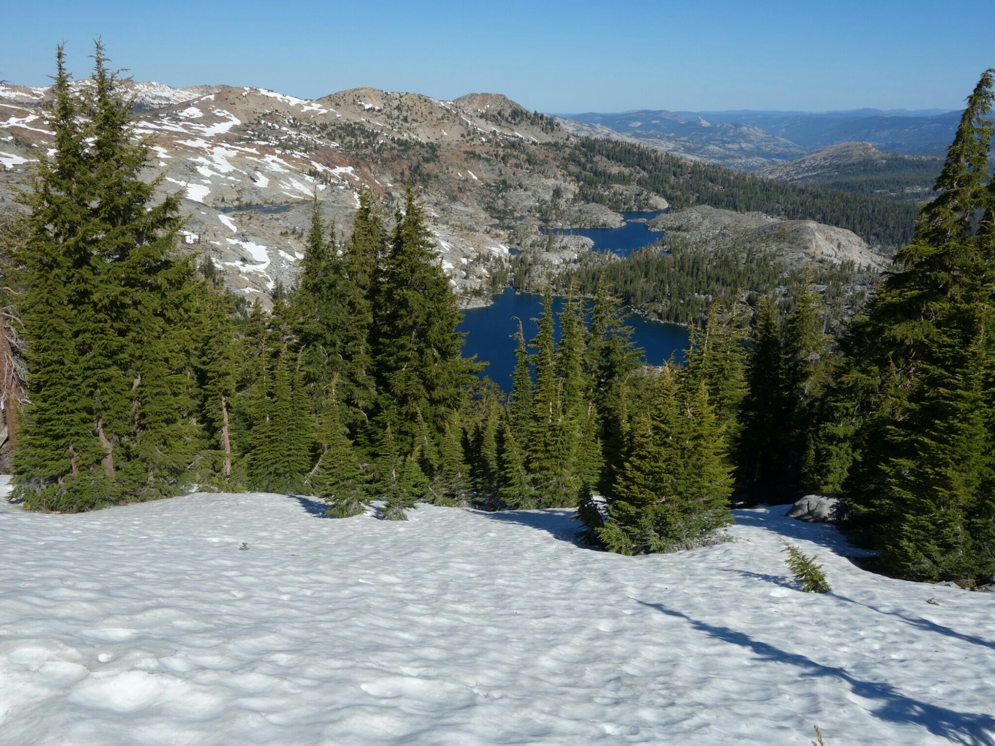 Descending the pass with Lake Aloha and Pyramid Peak in the distance.