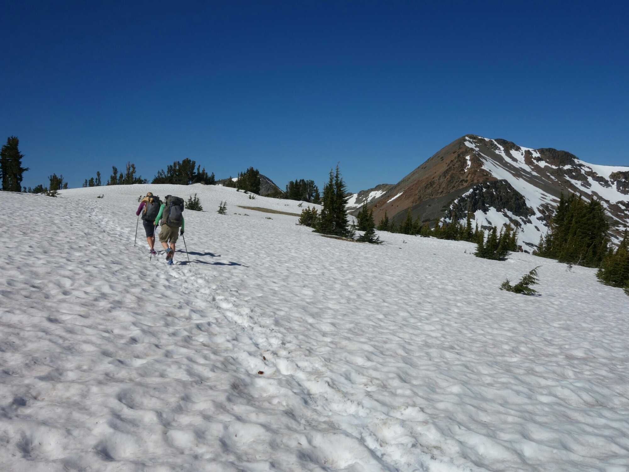 Dick’s Pass didn’t have nearly as much snow as we had been hearing about for days. It must be melting fast. We sat on top for about an hour. Cell service makes one do that. Plus more PCT thruhikers walked by.