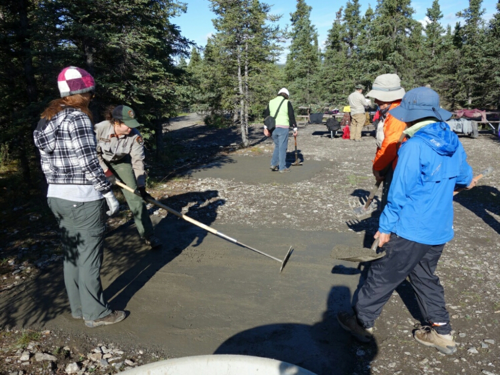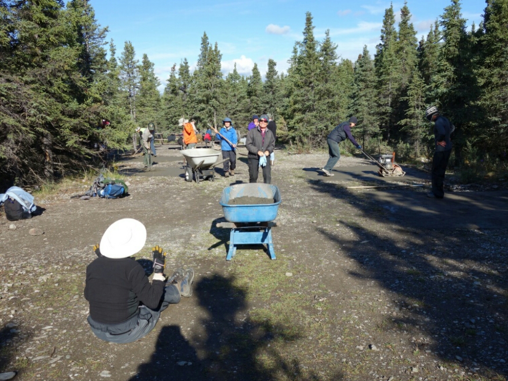 Monday morning we met Melody and Catherine, the 2 trail crew members who we were assigned to. Our first job was making more tent pads in our Savage River group campsite. Gravel from the nearby Teklanika River had been loaded in the back of a truck. Our job was to shovel it into wheelbarrows, rake it flat and compact it with a gas powered compactor.