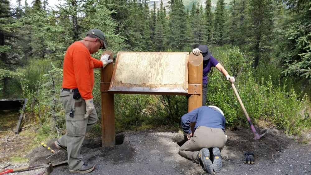 The next day it rained. All day. We removed 6 perfectly good informational signs on the Savage Cabin Trail and replaced them with ADA compliant signs exactly 32 inches from the ground to the bottom of the sign. The old signs had posts about 10 inches in diameter burried about 3 feet in the ground. Not that easy to dig out and very heavy to lift. We played in the mud all day.