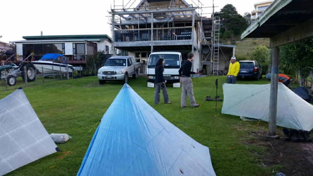 A dirt road took us thru the Russell Forest then out to a paved road. We walked to Helena Bay hoping for some camping possibility. We saw no-camping signs. Then Alex asked a guy who was working on his house if he knew where we could camp. Peter said we could camp in his yard! So that is where we are set up.