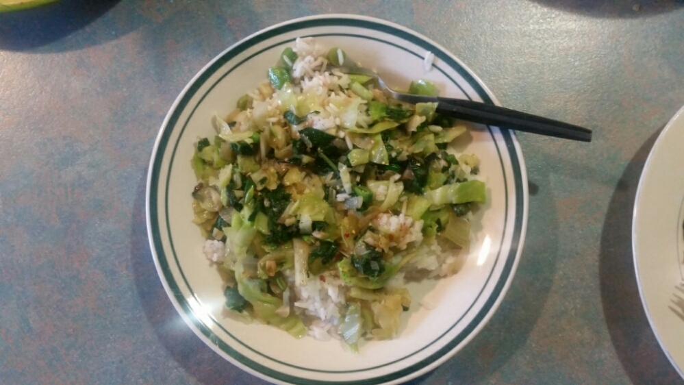 Helen and I picked peas, chard, a cabbage, celery, parsley, oregano and Tracy gave us 2 onions. I ate a burger with beef, egg, bacon, beet, lettuce and tomato at 3pm for lunch. After eating that a dinner of stir-fried veggies over rice was perfect.