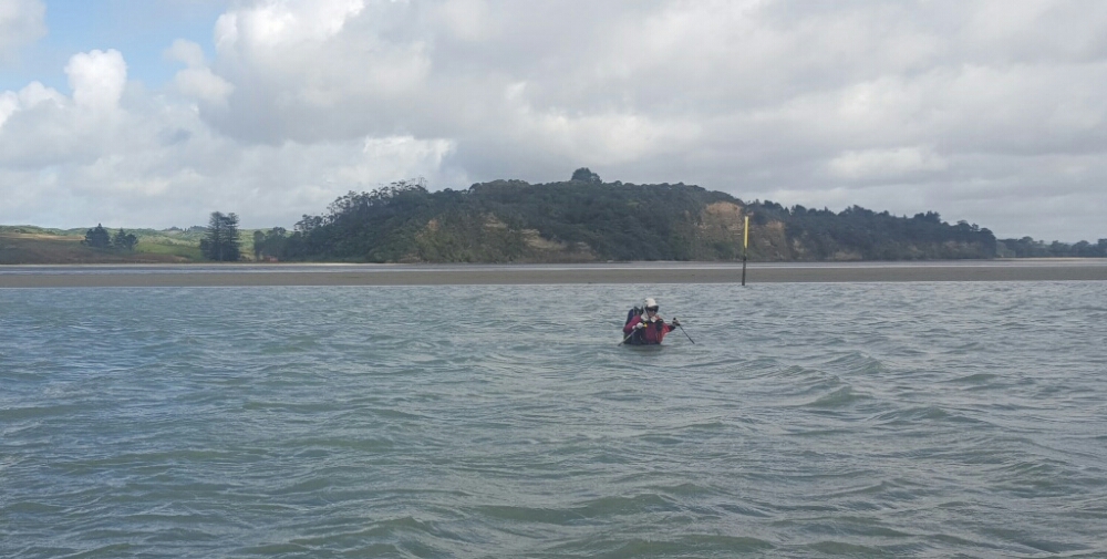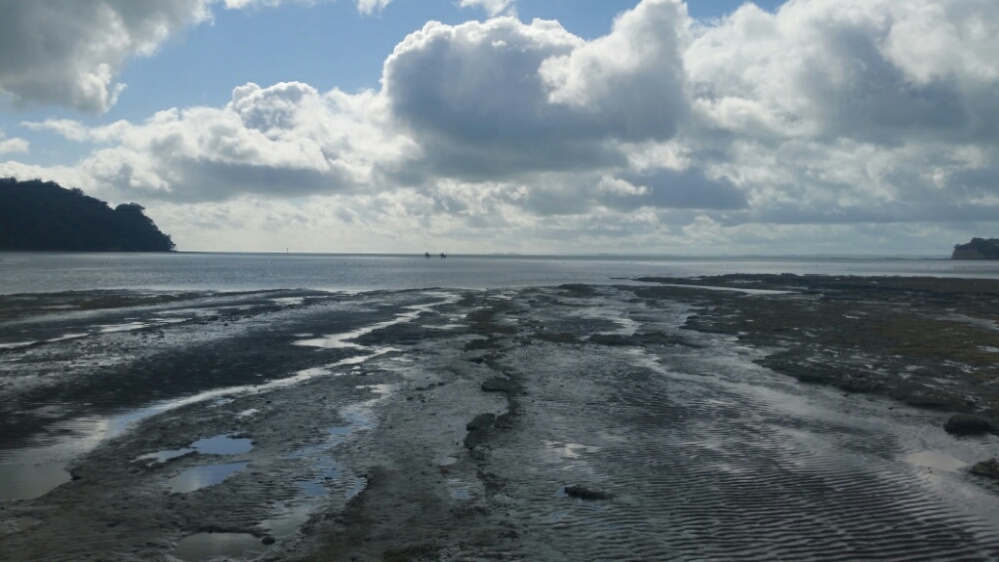 We had to wait for low tide at 10:30 to cross the Okura Estuary. It was still up over my waist and a bit scary.