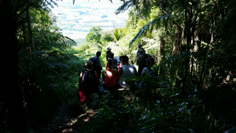 We said goodbye to our great little cabin and set off for the Hakarimata Walkway. There were LOTS of steps on each side of the traverse over the ridgeline. At one viewpoint we came upon Brett sharing his TA stories with some of the Auckland Tramping Club.
