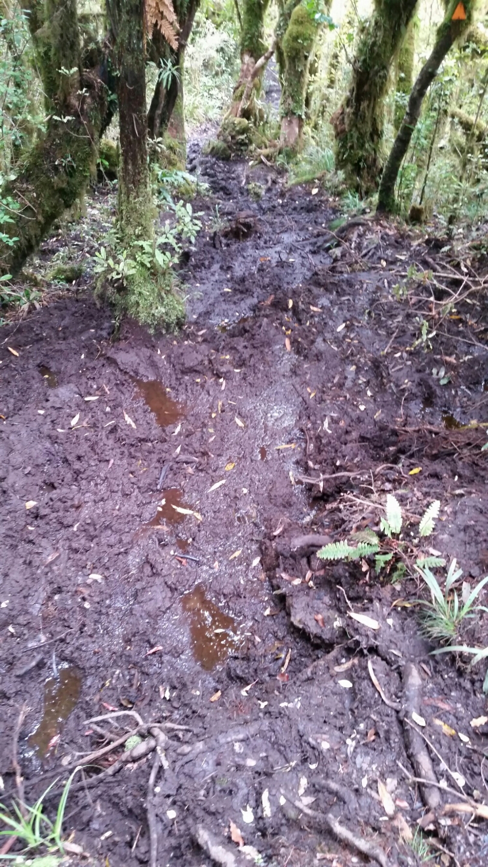 I had read a blog from last year by Kristine Collins. She describes the trail down from Mt Pirongia as The Hihikiwi Horror Track. It was definitely a mud fest. Deeper mud, more mud and more roots than the Rataea Forest. It was very slow going. From the hut to the top of Hihikiwi Peak was easy boardwalk and stairs. And then the fun began and went on and on and on.