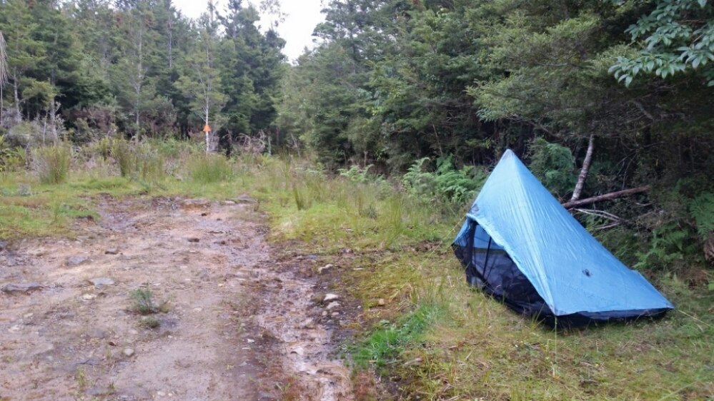 We wanted to get as far as possible today. There wasnt any obvious place to camp from reading the trail notes or map. At the end of the day we walked on a 4 wheel drive road thru a very dense forest. There was no where to camp until a small clearing where the road ended and trail started. There was one tent here with Paolo from Italy. It started to rain so I quickly set up my tent and jumped inside.