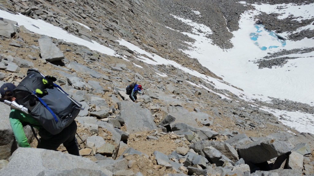 After the loose rocks we had snow of the perfect consistency for quick travel. If there was no snow we would have had way more boulders to scramble over.