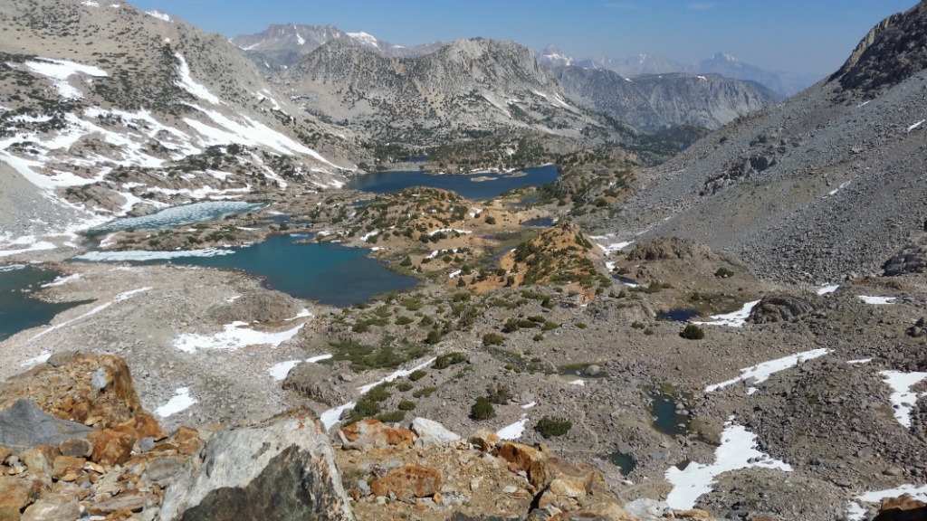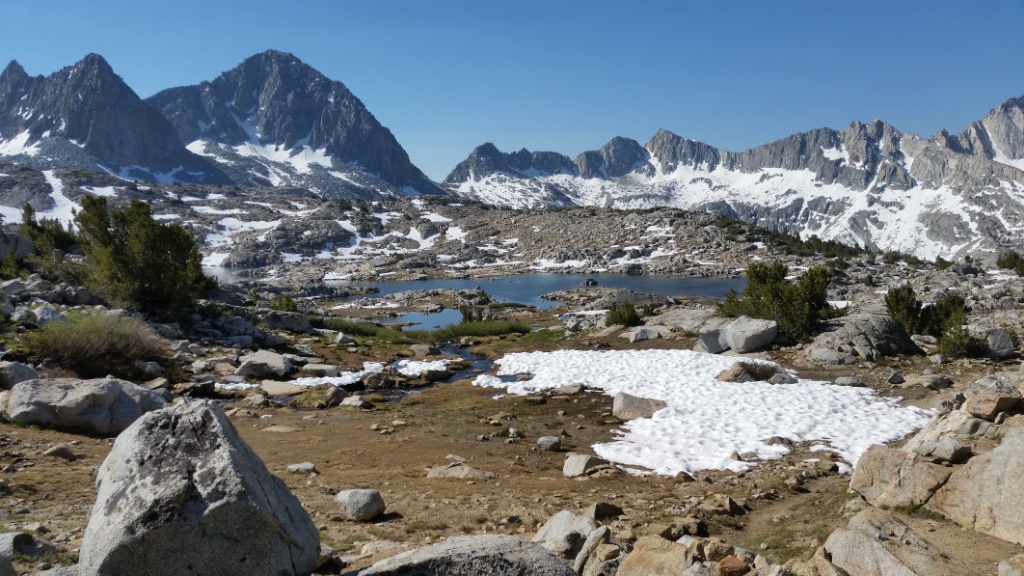 We descended into Dusy Basin with its many lakes and towering peaks. I had never been here before. I can now see why it is such a popular place. We intersected the Bishop Pass Trail and took that the rest of the way.