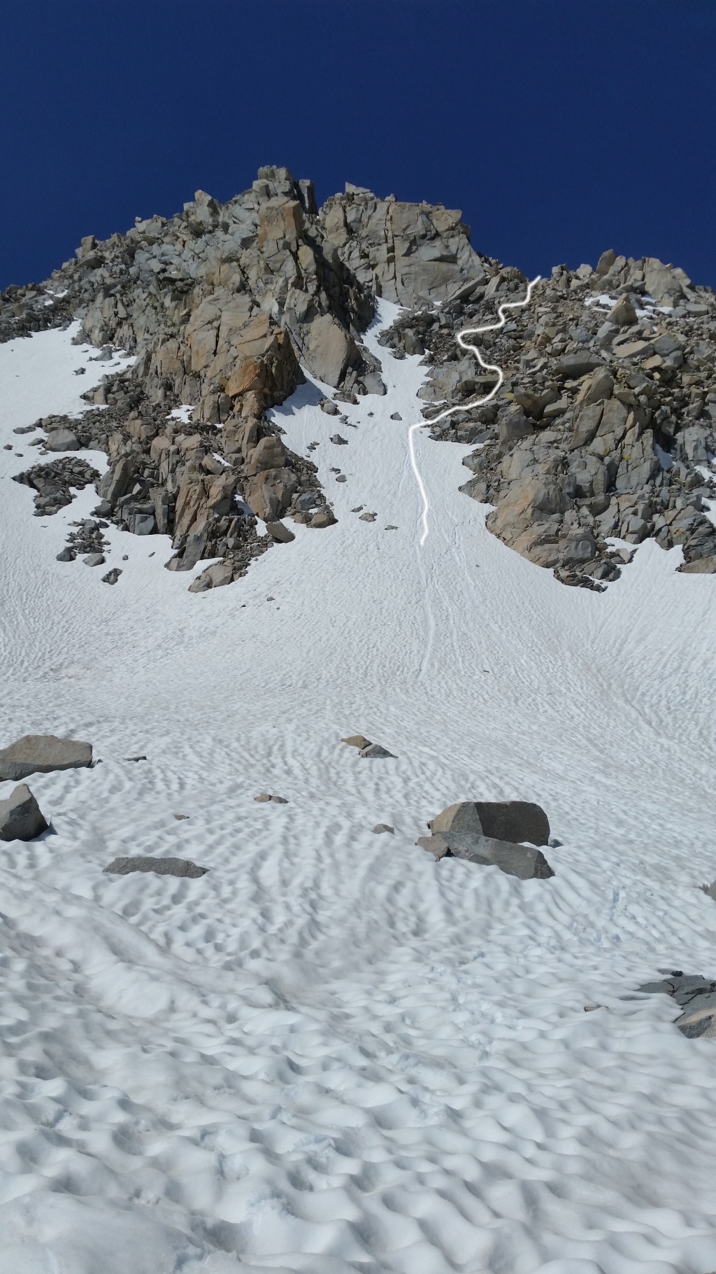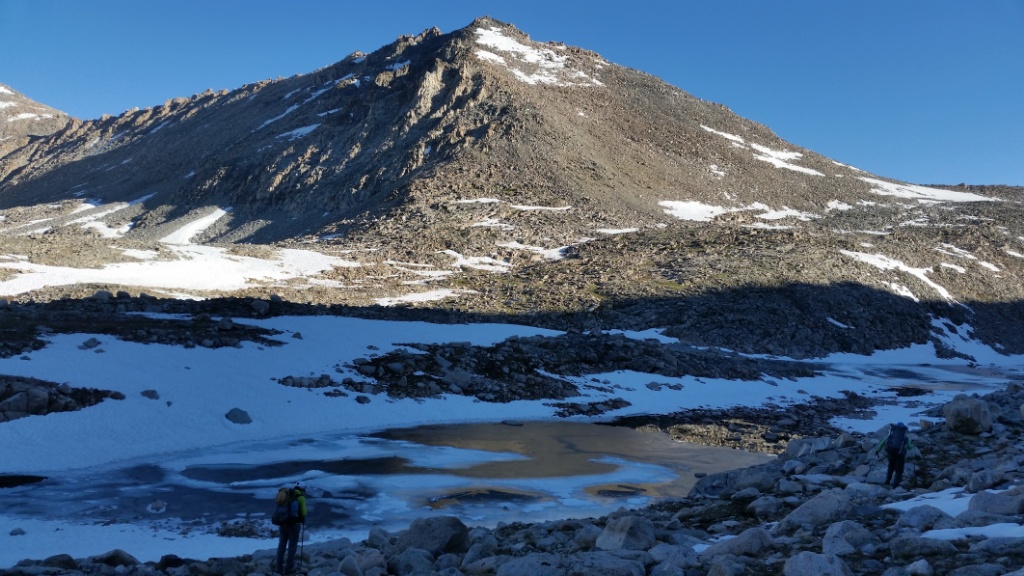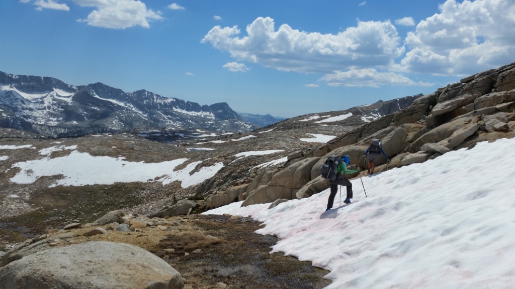 Snow was a big part of today again. It was very firm in the morning on the way up and microspikes helped us. The first part of the descent from Snow Tongue Pass was on STEEP, loose rock of all sizes. We were sure to not move when anyone was below us. Then we got on soft snow which made travel easier for awhile. Until we got to the huge boulders.