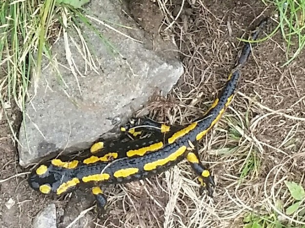 Salamanders are lovely, but not common, and you were lucky to see one. I was told that each year the bits that are yellow turn black, and the black bits turn yellow. I am still deciding whether I actually believe that 🙂