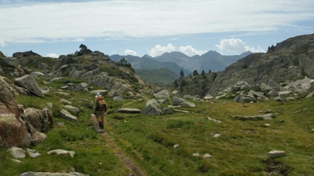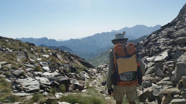 After a straightforward downhill we arrived at the unmanned Refugi Cinquantenari. Wired left her titanium cooking pot here 4 days ago and asked me to look for it. When we got to the refugi there was one Spanish guy. He said 3 Frenchmen and their dog were out fishing and were also staying in the refugi. I looked around. I could see a pot in a Gossamer Gear bag with one of the men’s belongings. It had to be Wired’s. I looked inside it. It was filled with dog food which is especially hilarious if you know Wired. She is no fan of dogs. Jim and I sat down in the refugi and ate our dinners hoping the 3 men would return to the refugi. They didn’t so we emptied the dog food out on the wrapping from our sandwiches. In case they didn’t speak English I typed into Google Translator asking if they found the pot before we walked back toward the men. It was definitely Wired’s and they were very nice about it. One of the men had a Tenkara fly fishing rod which I have read about but have never seen. Theirs was a special Pyrenees model. We talked about that some using the little english they knew.