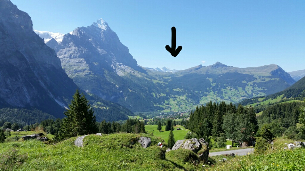 From Grosse Scheidegg we walked down to Lauterbrunnen and back up to Kleine Scheidegg which is the pass the arrow points to.