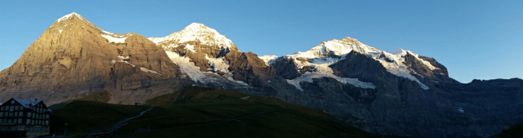 We got to Kleine Scheidegg (2061m) near the end of the day. We are staying at the Bahnhof Restaurant Hotel. The bunkroom plus breakfast is CHF55 each. Jim asked if one of the dorm rooms had a view. That question got us a free upgrade to a double room with an awesome view. Almost no one is here.