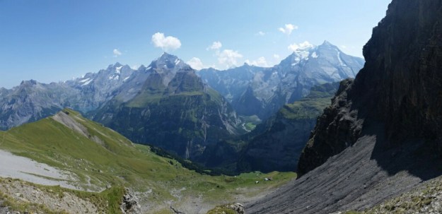 We took the gondola up out of town which allowed us to skip the hot walking in trees. We got out above treeline and had a great walk up to the pass, Bunderchrinde, 2385m. We had great views back to the Eiger, Mönch and Jungfrau. We could also see yesterday’s pass, the Hohtürli and the Oeschinensee.