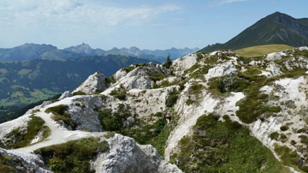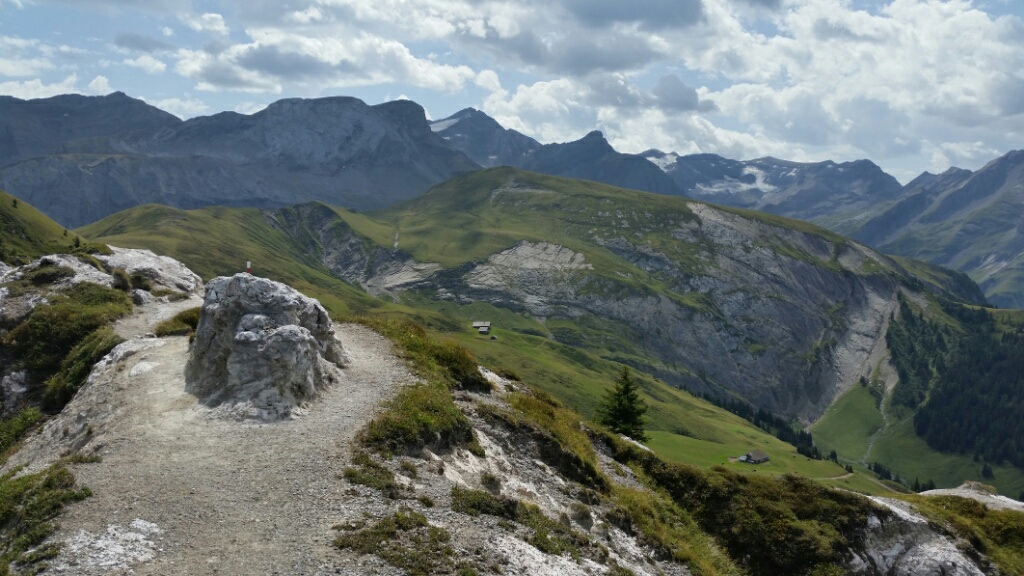 We decided to skip much of the next climb because it was mostly in the trees and it was hot and humid. The gondola took us 900 meters up and we got to walk a route with great views before we rejoined the other route at Trüttlisberg Pass, 2038m. We also walked over some really interesting limestone with big craters that looked like empty water holes.