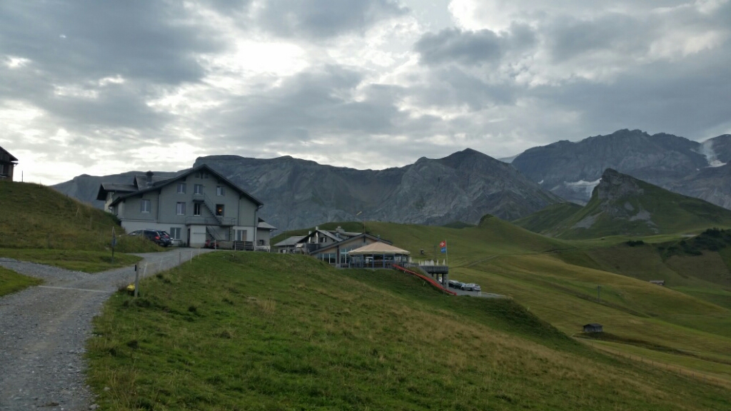 At 4:30 am it started to rain. That caught us by surprise. It stopped by 6 and our tents almost dried by the time we left. After about 40 minutes of paved road walking we arrived Hahnenmoospass, 1956 meters. It is probably the least exciting of all the passes. The paved road, ski lifts and non dramatic views made it just ho hum.