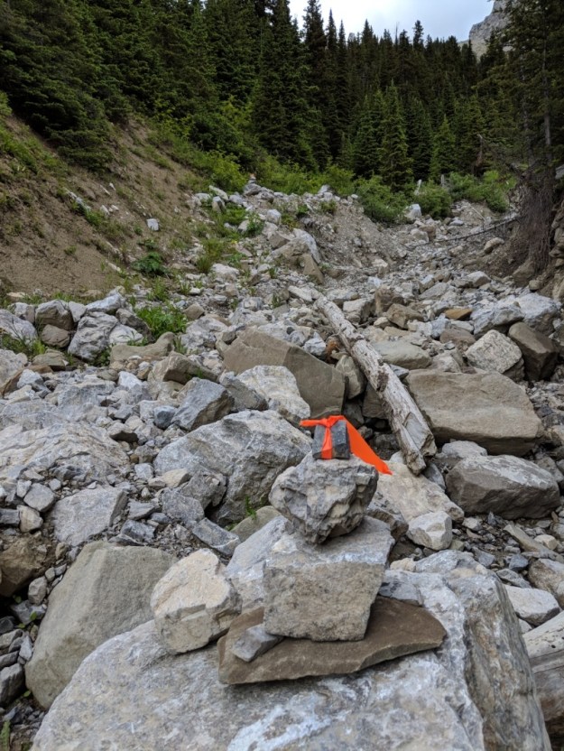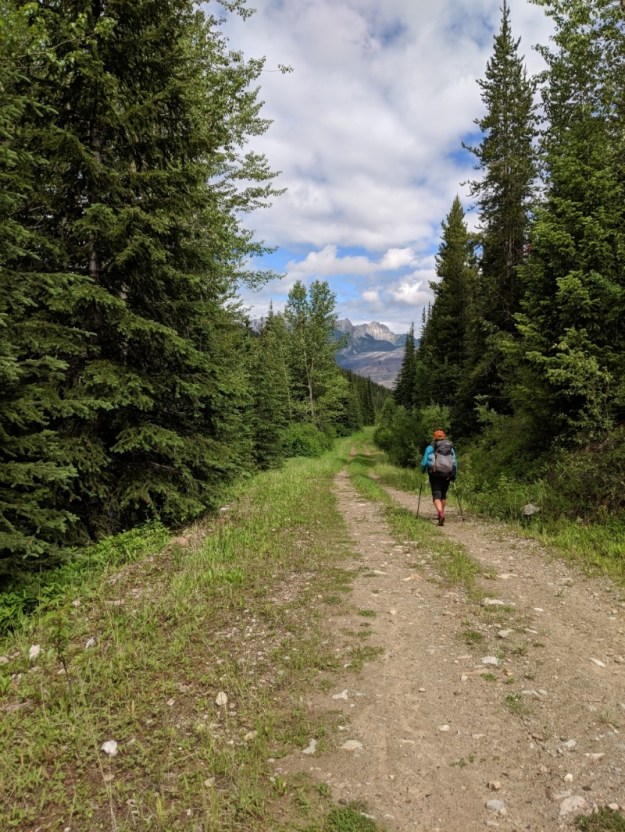 We walked on all logging or ATV roads until the end of the day. There was a huge avalanche that destroyed a section of trail. Some trail maintainers flagged a 6-8 km detour on an old road, game trails, and just thru the forest. They also cleared a path. It was fun finding the next flag. But also a lot of work at the end of the day.