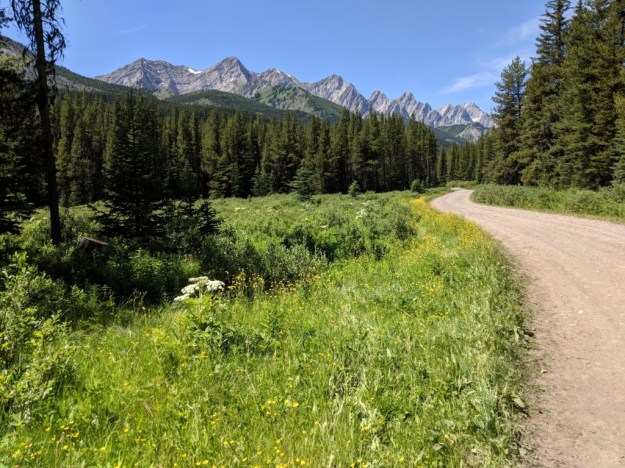 The special attraction of the day was watching over 30 cyclists ride by in small groups. Most are riding all or part of the Great Divide Ride which goes from Banff and ends in Antelope Wells on the New Mexico/Mexico border. 4 women from Italy were on their 3rd day of 45. A couple we talked to from Prince Edward Island were riding from Banff to Vancouver. It was interesting to see the variation in bikes and how they carried their gear. The reason we crossed paths with the cyclists it’s that the majority of the day’s walk was on a gravel road. Ugh. I used my umbrella to great advantage again today. Bring your own shade.