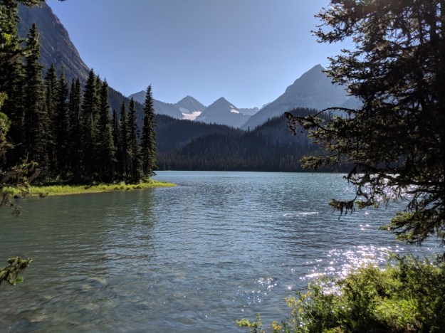 We are now camped in an actual campground at Lower Elk Lake. It’s a half mile walk in from the parking lot. The lake is beautiful with mountains and their glaciers as a backdrop. It was fun interacting with some of the other campers.