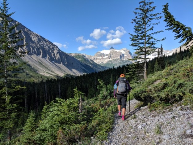 It was windy at the pass. We found a semi sheltered spot and ate lunch. It’s a very short day so we had time for lots of breaks. It wasn’t long on the way down before we saw IT. Mt Assiniboine is mighty and majestic and I could stare at it all day. This is a very popular area (LOTS of people) but there is a reason. It is amazing. There is the very expensive Mt Assiniboine Lodge which many people helicopter into. They allow hiker trash to enjoy tea, beer or wine from 4 to 5 every day. We planned out day around this! Magog Lake campground fills up fast. 2 days ago we were fortunate to be able to get a last minute site.
