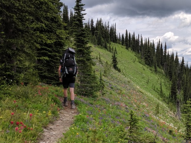The wildflowers are still abundant. We had some great views all the way back to Glacier. This East West trail is really circuitous. We headed mostly north all day.