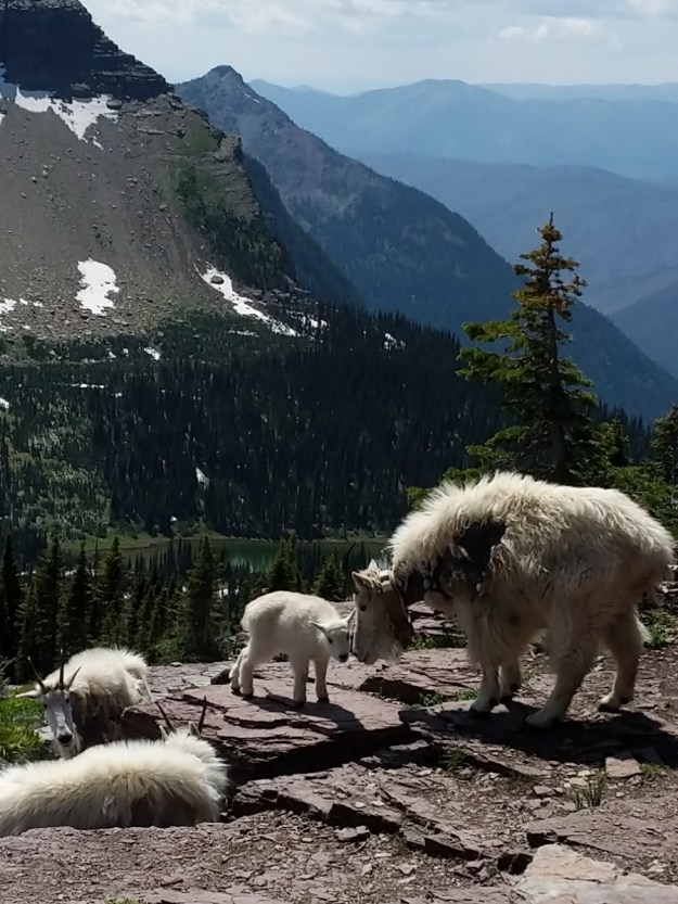 We drove up Going To The Sun Road and stopped at Logan Pass. On a short walk up Lunch Creek we saw a big horn sheep running down a snow bank. The Hidden Lake overlook hike was great with glacier lilies, other wildflowers and mountain goats (mammas and babies.)