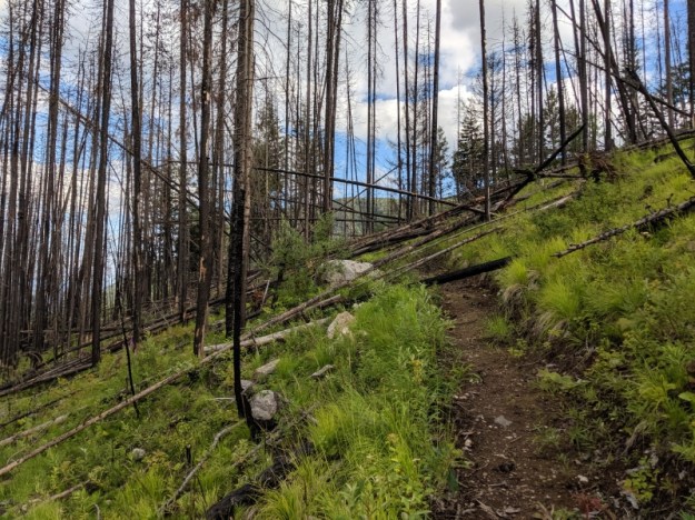 My payoff is one of the best views of all campsites on this hike. I’m beat up. My shins are bruised and bleeding. My pants are covered in soot from climbing over the burned trees. I haven’t been this tired in a long time. I was too tired to even eat dinner