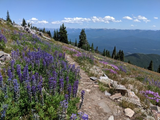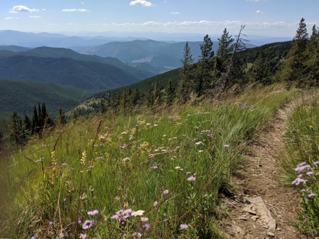 I climbed up for the first half of the day to Ambercrombie Mtn and then downhill the 2nd half. The wildflowers and huckleberries were still plentiful at certain elevations.