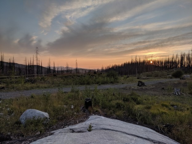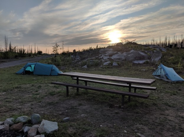 I am now camped with the Brits at Boulder Creek Summit Campground. It’s a car campground but it’s been closed since the 2015 fire. It has an open, stocked and clean privy, picnic tables, and no one else is here. Many of the burned trees have been removed and there isn’t much bare dirt like most campgrounds. And we are on top of a saddle with nice views.