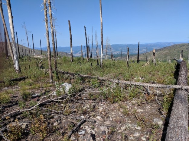 All the road walking of the last 2 days was to get us to the Kettle Crest National Recreation Trail. It’s a well known trail in Washington and extends for over 40 miles. It starts at this campground and runs south, crosses Highway 20 and continues for about 10 more miles. Unfortunately half of it burned so we walked thru more old burn areas. The views were expansive but dimmed somewhat by smoke or haze.