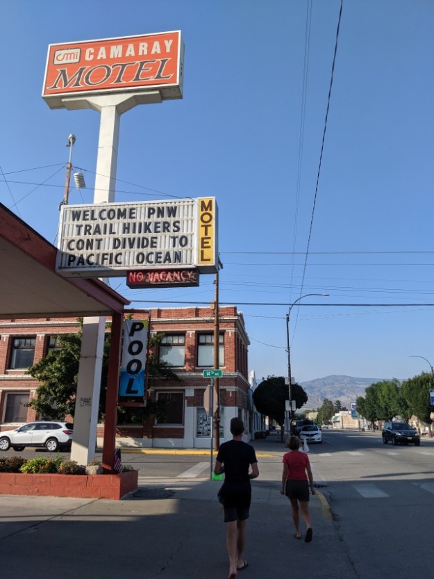 So now we are checked into the Camaray Motel in Oroville. Good thing we called ahead because by the time we got here they were full. The closest other motel is 10 miles north. In Canada! The owners love PNT hikers and we love them! Discount and free laundry. Plus in the laundry room there was a spray bottle of OxyClean. My light grey pants have never gotten clean since the major log hopping on Parker Ridge. Most of the stains are now gone. I look a bit less homeless.