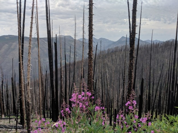 It was cloudy all day. In the afternoon it started raining. At times it was real heavy rain. It even hailed. I waited under trees and my umbrella for the worst of it. There wasn’t much wind so my umbrella was perfect. Luckily the rain stopped enough so we could get thru the burn area to an area suitable for camping. Plus a creek is nearby.