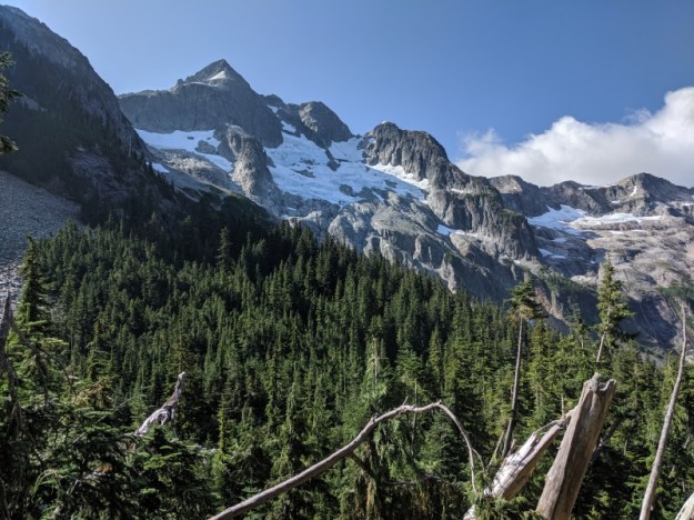 Today was great. Slow but nice views. The climb up Whatcom Pass is described as one of the toughest on the entire PNT. 1700 feet up in one trail mile. It was tough and also an amazing engineering feet to build a trail up that steep slope. There were great views of Whatcom Peak and it’s glaciers while going up.
