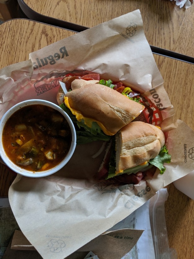 They let us off near the trailhead but also near a sign saying “Cafe Open.” This was a pleasant surprise. I quickly devoured a hot Italian sub and bowl of vegetable soup. Then followed that with a big chocolate chip cookie and zucchini muffin. My body is craving more and different food than I’m giving it.