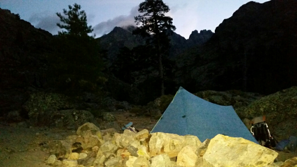 We are camped at Auberge U Vallone. All the flat areas close to the Auberge were taken but there were some great places a little uphill. When we first got here we were the only ones up here. Now there are tents all around. We ate dinner at the Auberge…. bean and pasta soup, pasta with veal and cheese for desert. And wine. It was good.