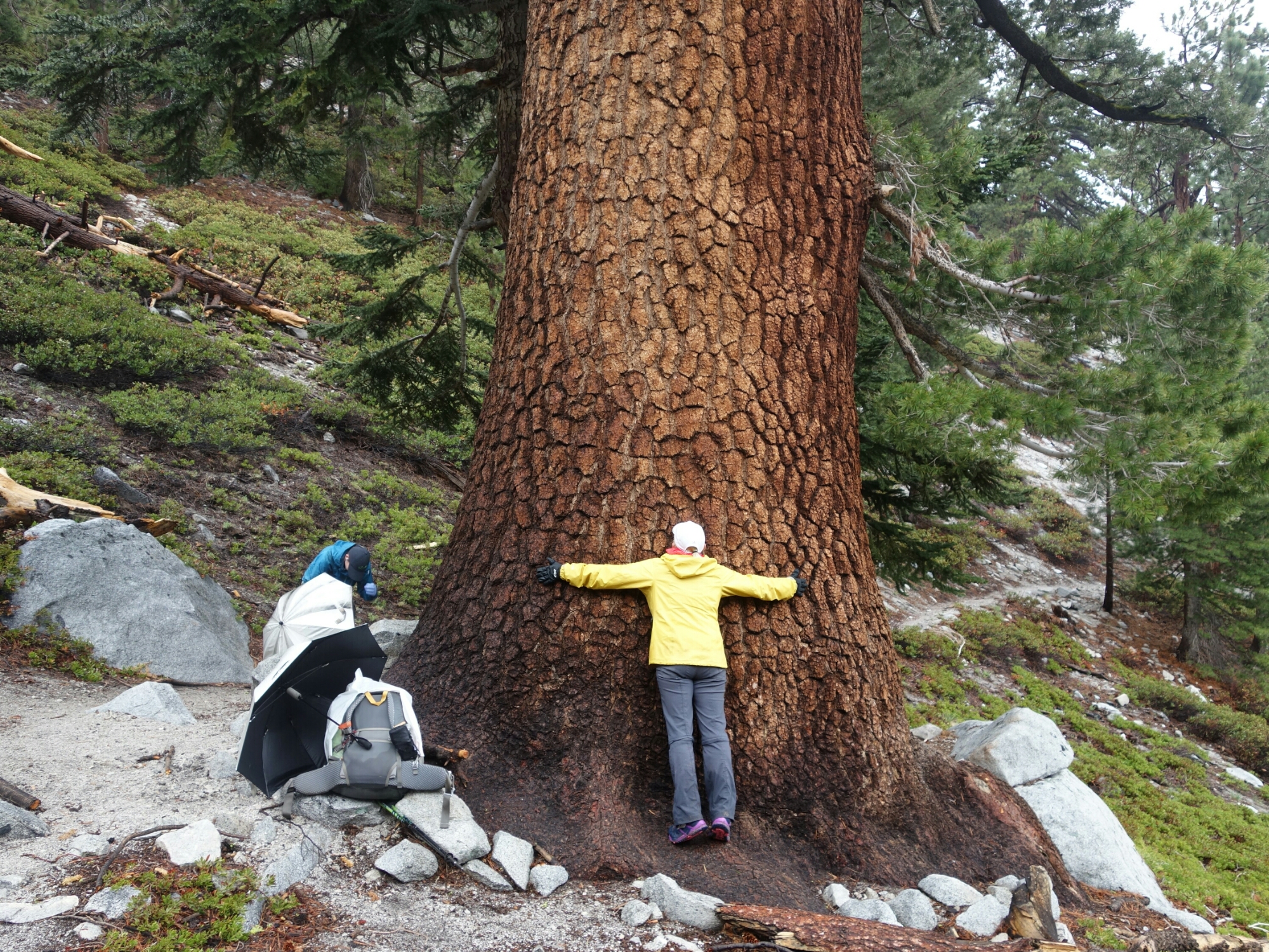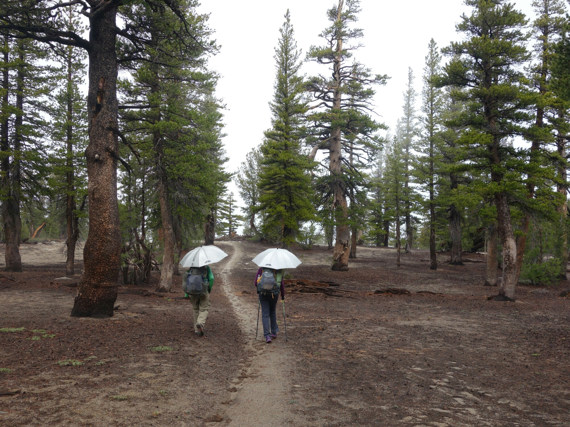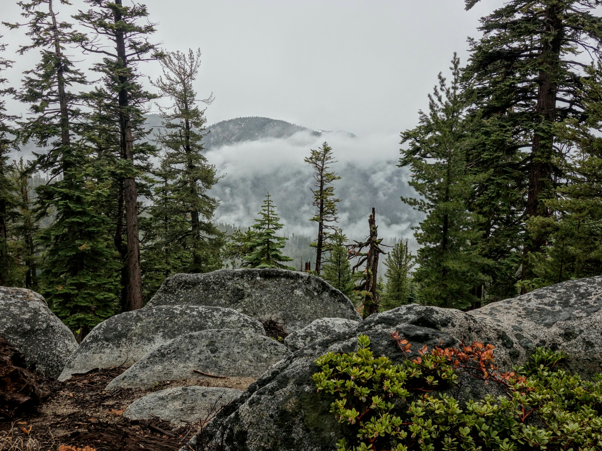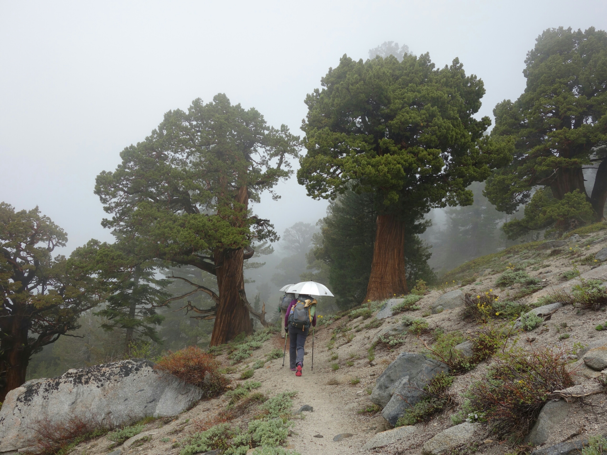 It started raining pretty early in the day. And it kept raining ALL day. And with the rain came low clouds preventing us from seeing any view. This is usually a section with lots of views and we saw nothing. But I still loved the day. I think it is more unusual to see this section the way we did than with expansive views. After all, it never rains in California! Or in Nevada where we were for half the day. Rain is also so much easier to deal with when you know you won’t be pitching a tent in it.