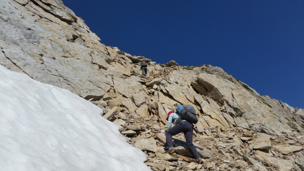 Europe Peak was fun to climb. We climbed up some great granite and grassy ramps. Part way up we tried to locate the waypoint to help us find the “15 or 20 foot slab with good handholds on the right side; it’s a corner and not airy.” That just got really confusing so we went back to figuring it out ourselves. Once on top we took a nice long break.